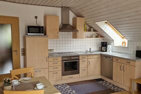 Leckere Mahlzeiten bereiten Sie in der komfortablen und großzügigen Wohnküche zu. Ausgestattet mit Kühlschrank und Gefrierfach, Geschirrspülmaschine, Mikrowelle, E-Herd mit vier Herdplatten, Backofen und Dunstabzug, Kaffeemaschine, Rührgerät, Toaster und Wasserkocher.