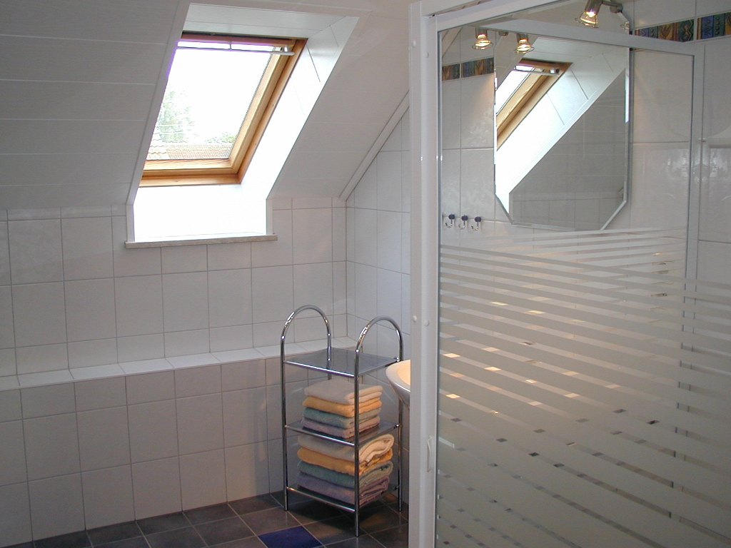 Zur Erfrischung gibt es im Bad (6qm) mit Fenster eine Dusche (90x90cm), Waschbecken, Dusch- und Handtücher. Das WC ist getrennt vom Bad.