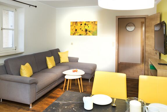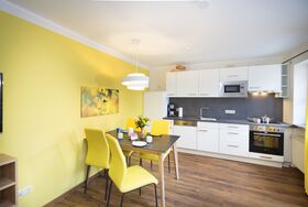 Sie werden sich in dieser großzügigen und hellen Sonnenwohnung im Erdgeschoss gleich wie Zuhause fühlen. 80 qm Wohnfläche bieten Ihnen jede Menge Platz für einen entspannten Urlaub. Die Wohnung ist für bis zu 4 Personen bestens geeignet und verfügt auch über ein separates Kinderzimmer. Auf der herrlichen Südwest-Terrasse starten Sie mit frischen Semmeln, hofeigener Marmelade und einem leckeren Milchkaffee in den Tag. Ihre Kinder oder Enkel erreichen von der Terrasse aus direkt die großen Spielbereiche. Die moderne und hochwertige Ausstattung der Wohnung garantiert Ihnen einen F****-Sterne-Komfort (DTV).