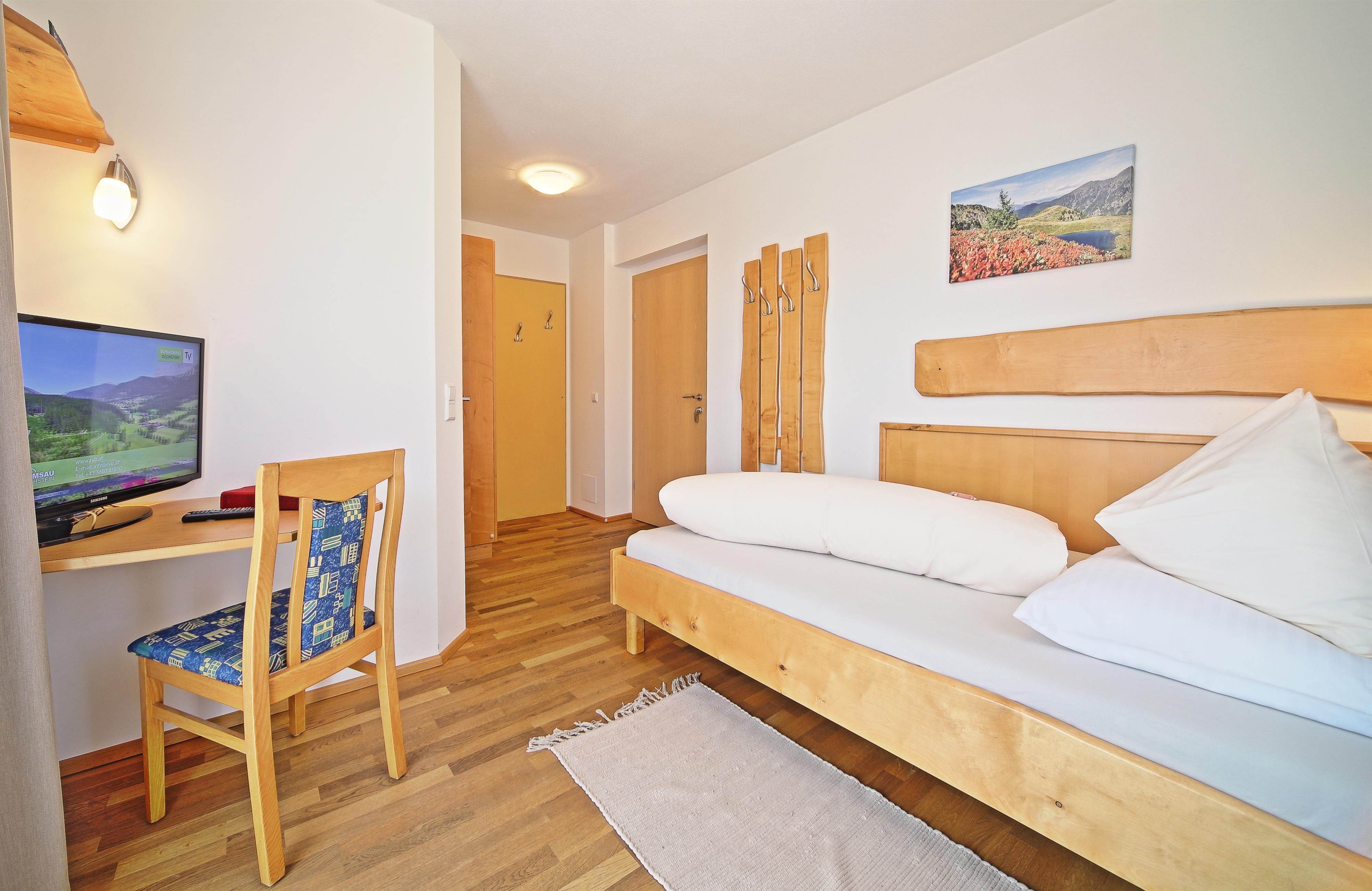 Komfortables Dreibettzimmer mit Dusche und WC, Balkon, Kabel-Flat, Radio, Safe und gratis W-LAN. In unmittelbarer Nähe vom Zentrum in Rohrmoos. Saunabereich; Frühstücksbuffett.