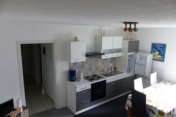 In unserer Ferienwohnung 1 im Parterre, leicht zu erreichen über eine 3 Stufige Treppe,erwartet Sie eine große Wohnküche mit Esszimmer für 5 Personen. Dort sitzt man Abends o. zum Essen zusammen u. sieht Fernsehen