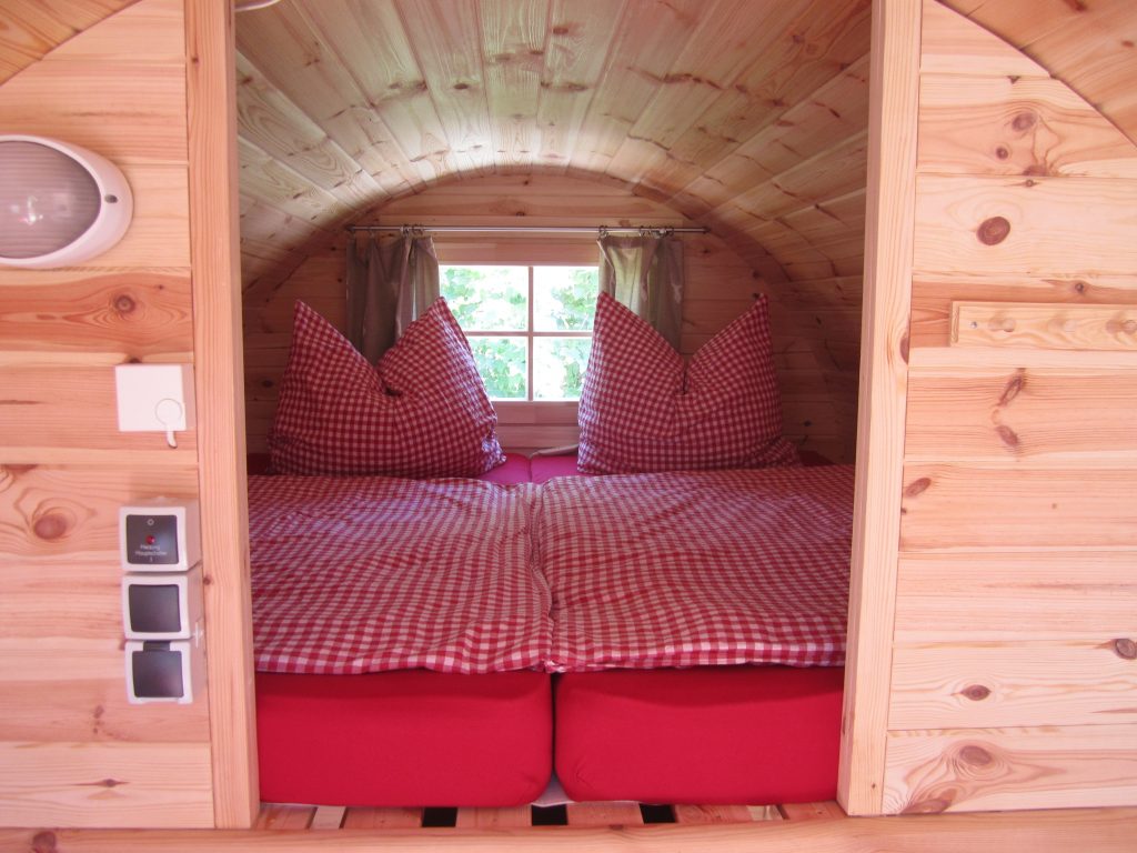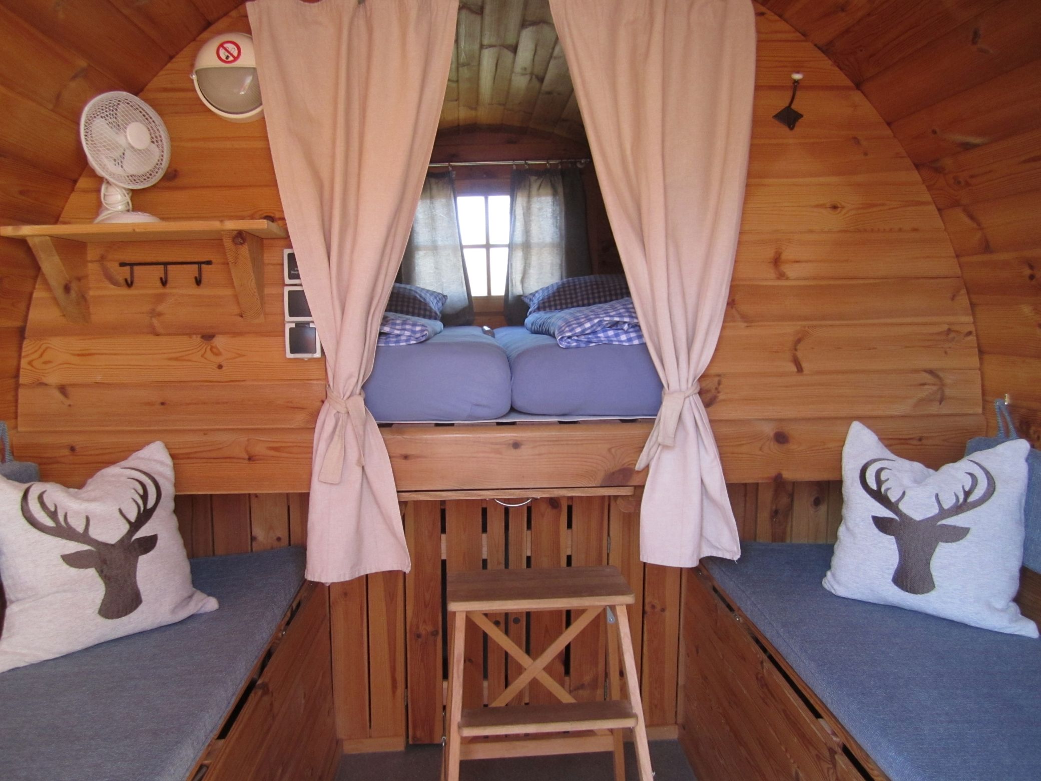 Bei schlechtem Wetter ziehen Sie einfach den Tisch unter dem Bett hervor und verwandeln das Schlaf- in ein Wohnfass und für kühlere Temperaturen gibt es eine eingebaute Infrarotheizung für gemütliche Abende.