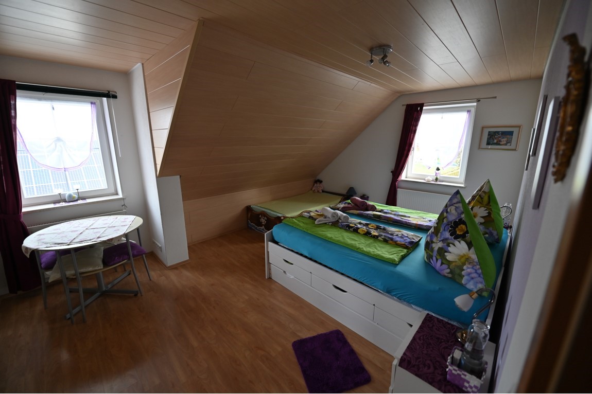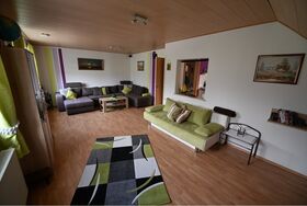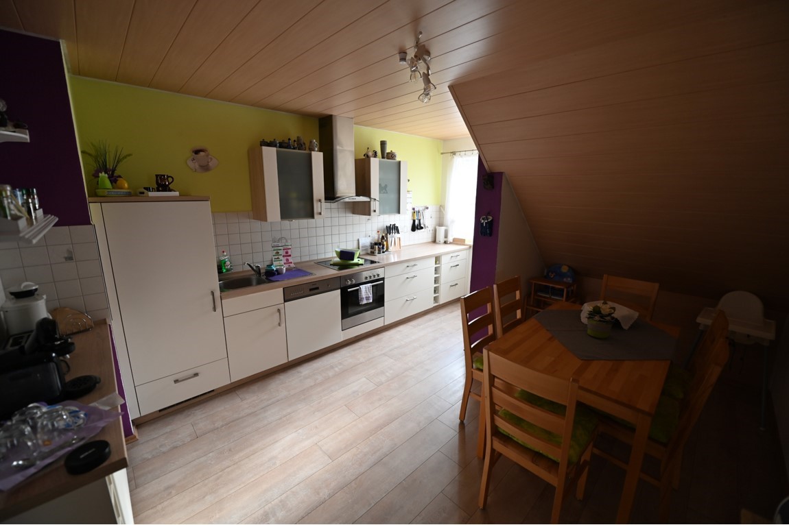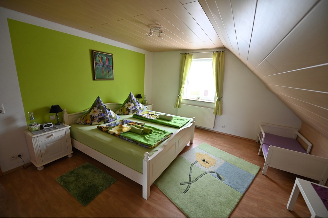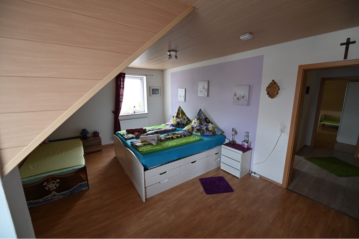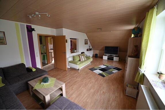 Unsere Wohnung liegt im 1. OG eines zwei Familienhaus und besteht aus drei Zimmern, einem Flur, Bad mit Wanne und Dusche, Küche mit Essecke. Die Wohnung ist 102 qm groß und hat einen Laminat-Fußboden bzw. das Bad ist gefliest. Unser Haus ist ein Nichtraucherhaus, vor der Tür befindet sich aber eine überdachte Raucherecke. Unser Haus und Garten sind mit kostenfreiem WLAN ausgestattet. Das gemütliche Wohnzimmer verfügt über einen 142 cm großen Fernseher, einen Blu-Ray-Player und eine Dolby-Surround-Anlage. Die Couch kann als Schlafmöglichkeit verwendet werden. Beide Schlafräume sind mit jeweils einem Doppelbett ausgestattet. Das geräumige Badezimmer mit Badewanne und ebenerdiger Dusche rundet das Gesamtbild ab. Das WC ist 5 cm höher als normal und wird von großen und älteren Menschen gerne angenommen. Im Badezimmer befindet sich auch eine Waschmaschine. Die Wohnküche mit Cerankochfeld, Kühlschrank mit Gefrierfach (extra Tür), Dunstabzugshaube, einem Kinderstuhl, Spülmaschine und einem Tisch mit 6 Stühlen lädt zu gemütlichen Kochabenden ein.