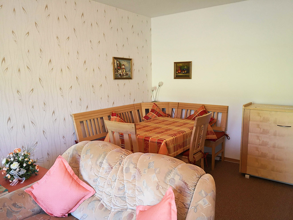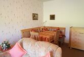 Wohnzimmer mit gemütlicher Essecke und kleiner Terrasse. Separates Schlafzimmer mit großem Doppelbett, Kaltschaummatratzen und verstellbaren Lattenrosten. Küche mit moderner Küchenzeile, Bad mit Badewanne und Duschmöglichkeit.