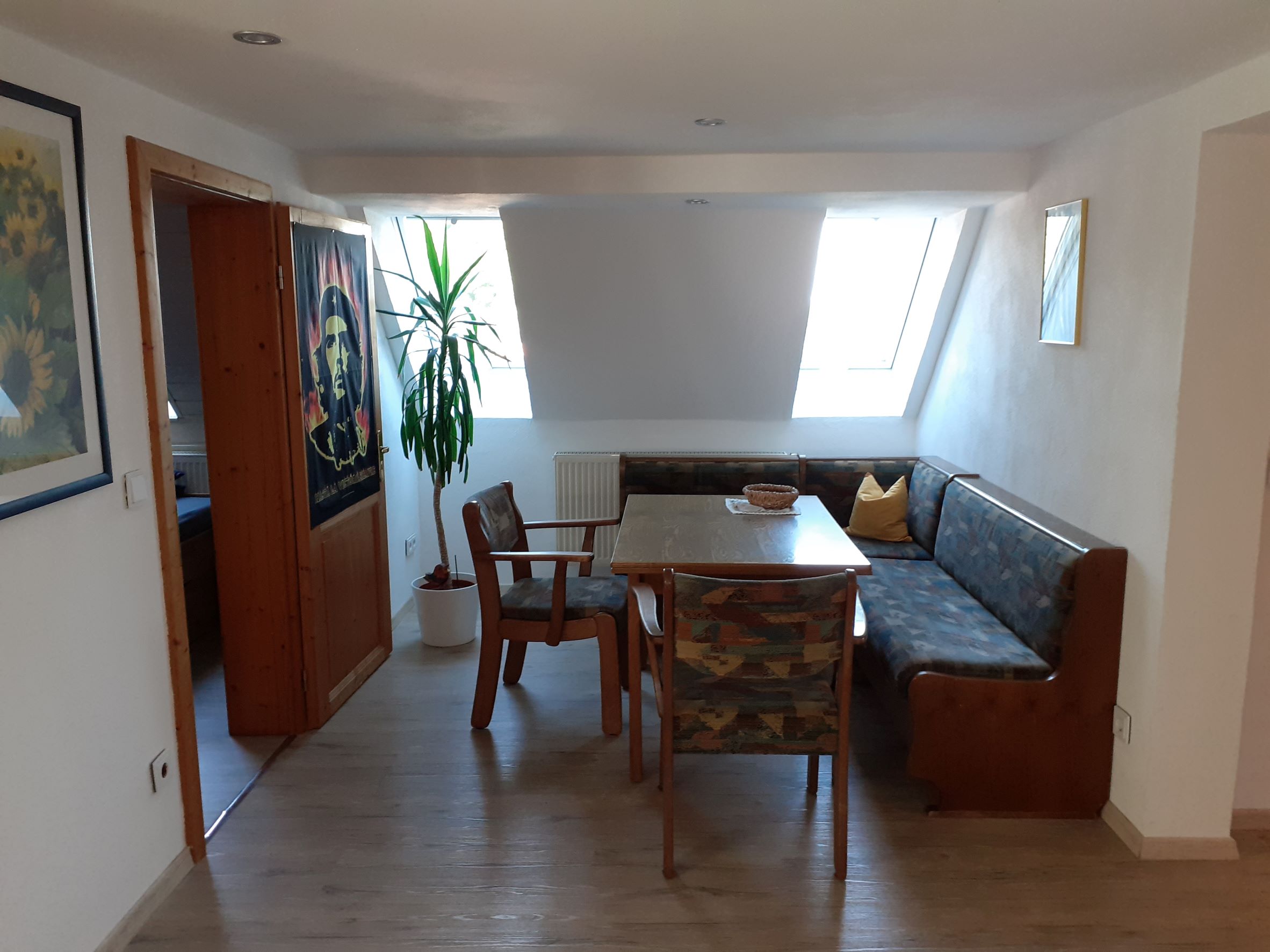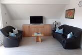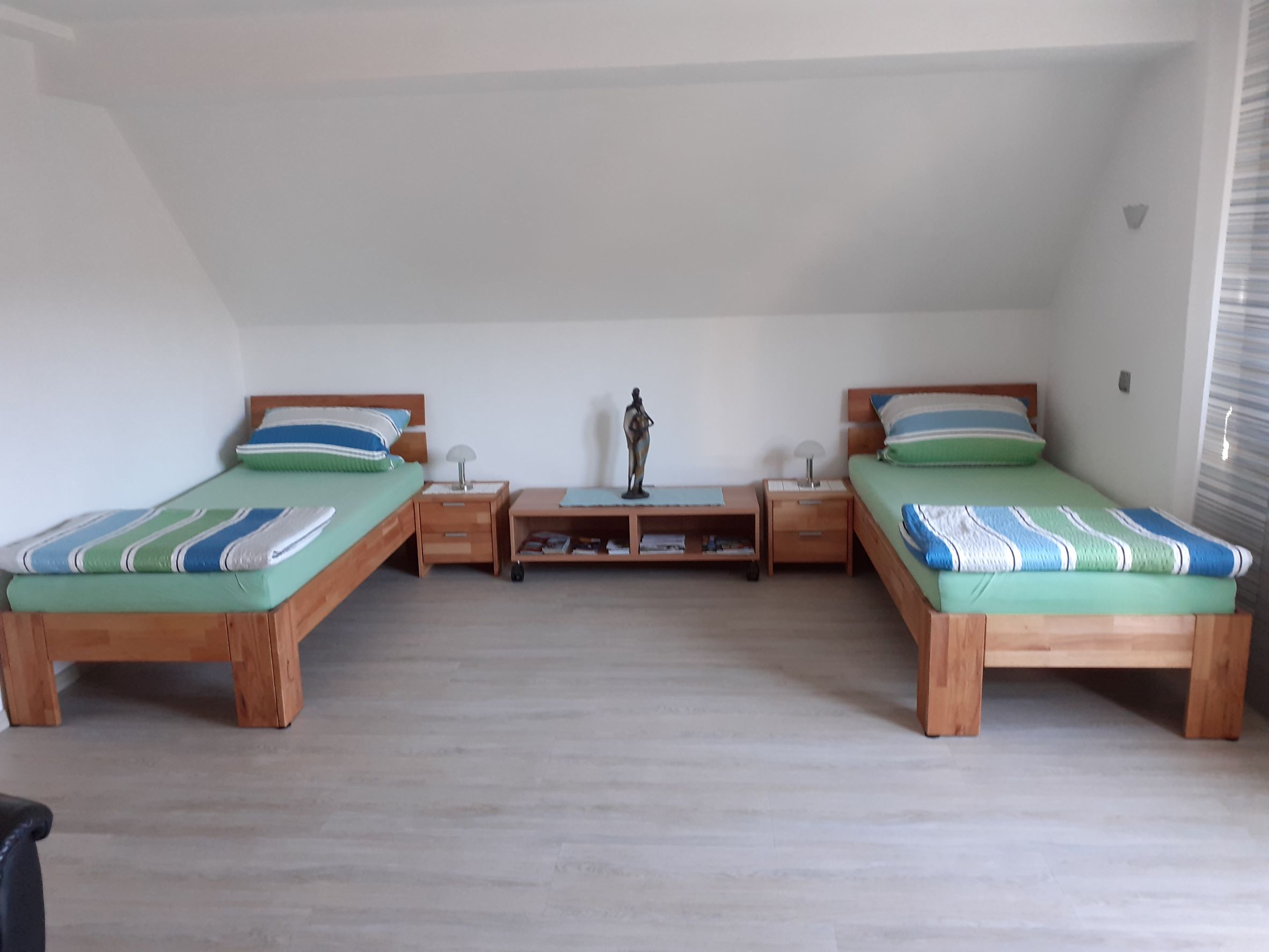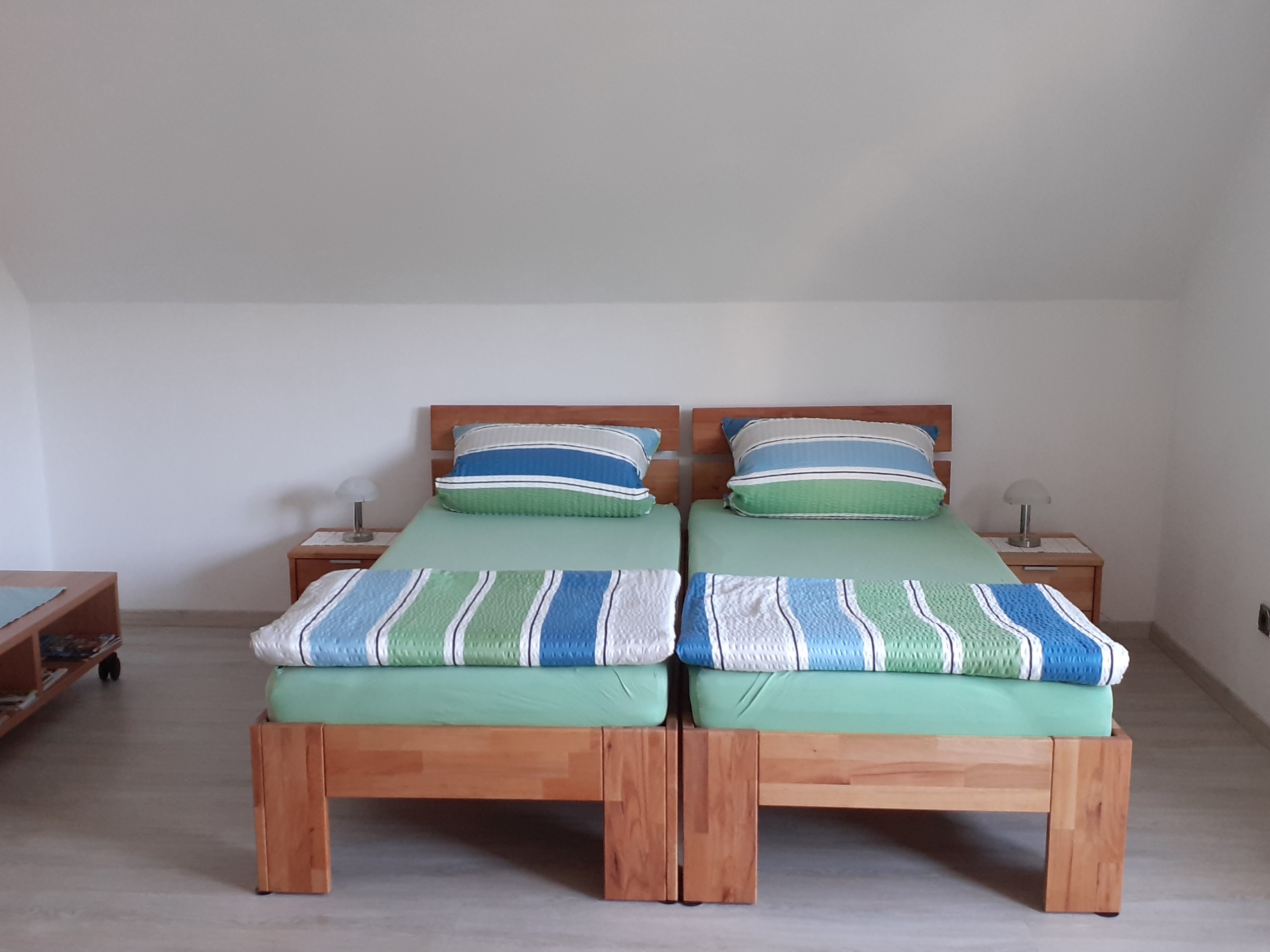 Die Ferienwohnung (67qm) befindet sich im Dachgeschoss unseres Hauses und bietet Platz für 4 Personen, mit Zustellbett sogar für 5 Personen. Sie verfügt über ein Schlafzimmer mit französischem Bett (1,40 x 2m )mit Flachbild-TV, und ein Wohn-Schlafzimmer mit 2Einzelbetten (die man auch zu einem Doppelbett zusammen stellen kann ) und Sitzbereich mit Flachbild-TV. Die komplett ausgestattete Küche mit Geschirrspüler, Kühlschrank, Herd, Backofen, Wasserkocher und Toaster lässt keine Wünsche offen. Einem geräumigen Badezimmer mit Dusche, WC, Waschtisch mit großem Spiegel, Fön und Handtuchtrockner rundet das Gesamtbild ab. Eine kleine Sitzgruppe und Parkmöglichkeit befindet sich vorm Haus. Bettwäsche und Handtücher sind vorhanden.