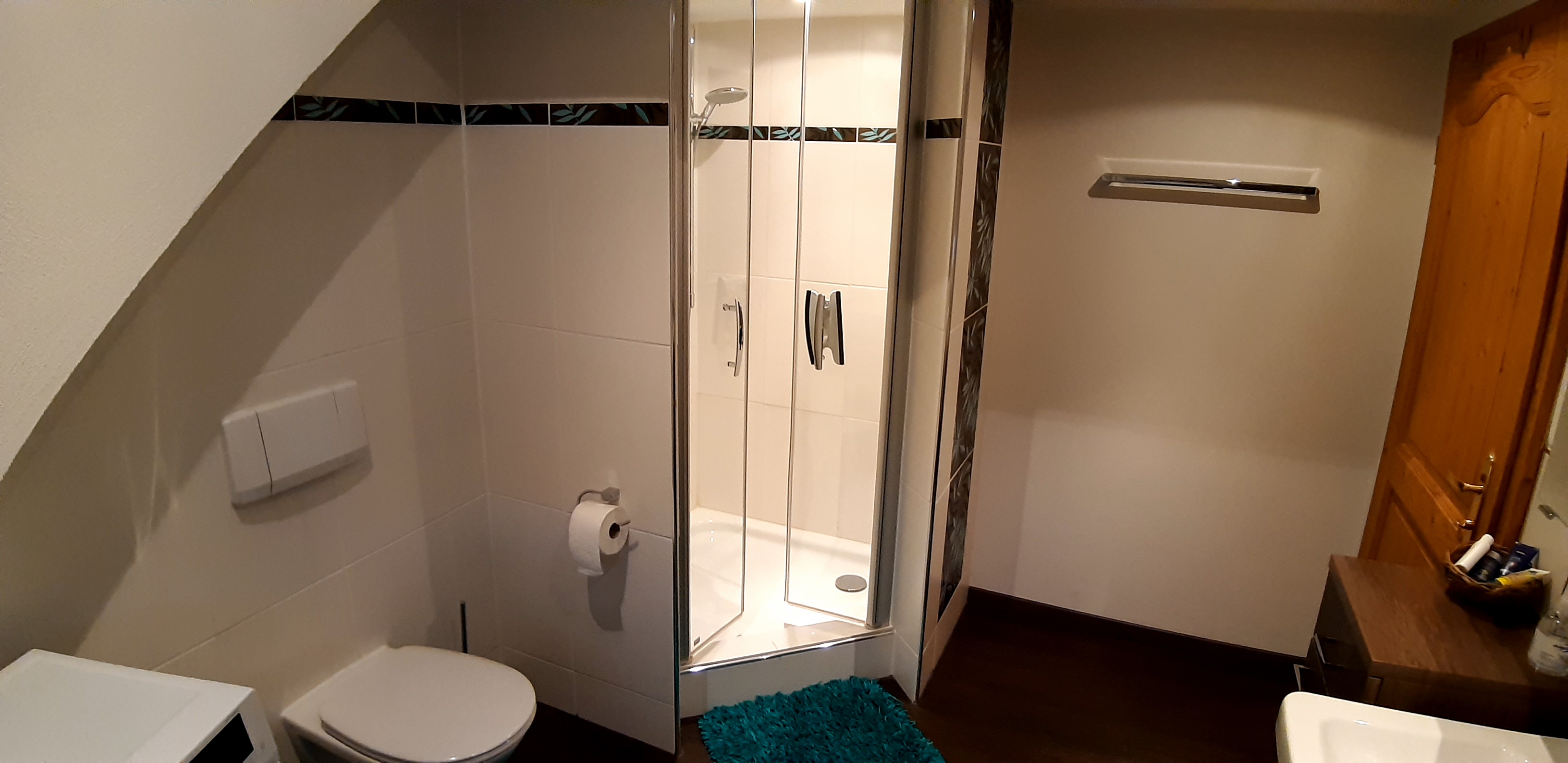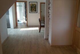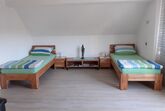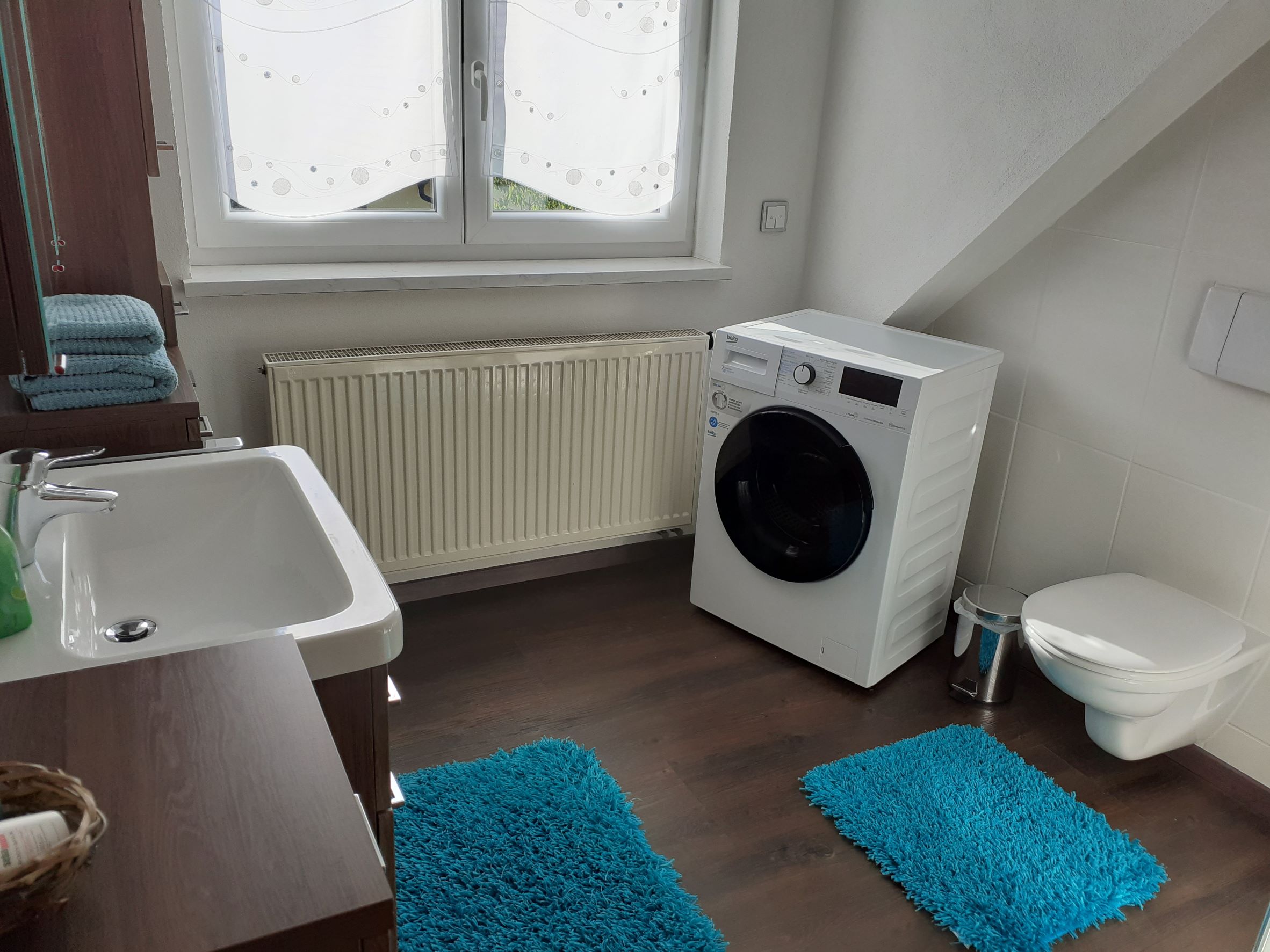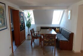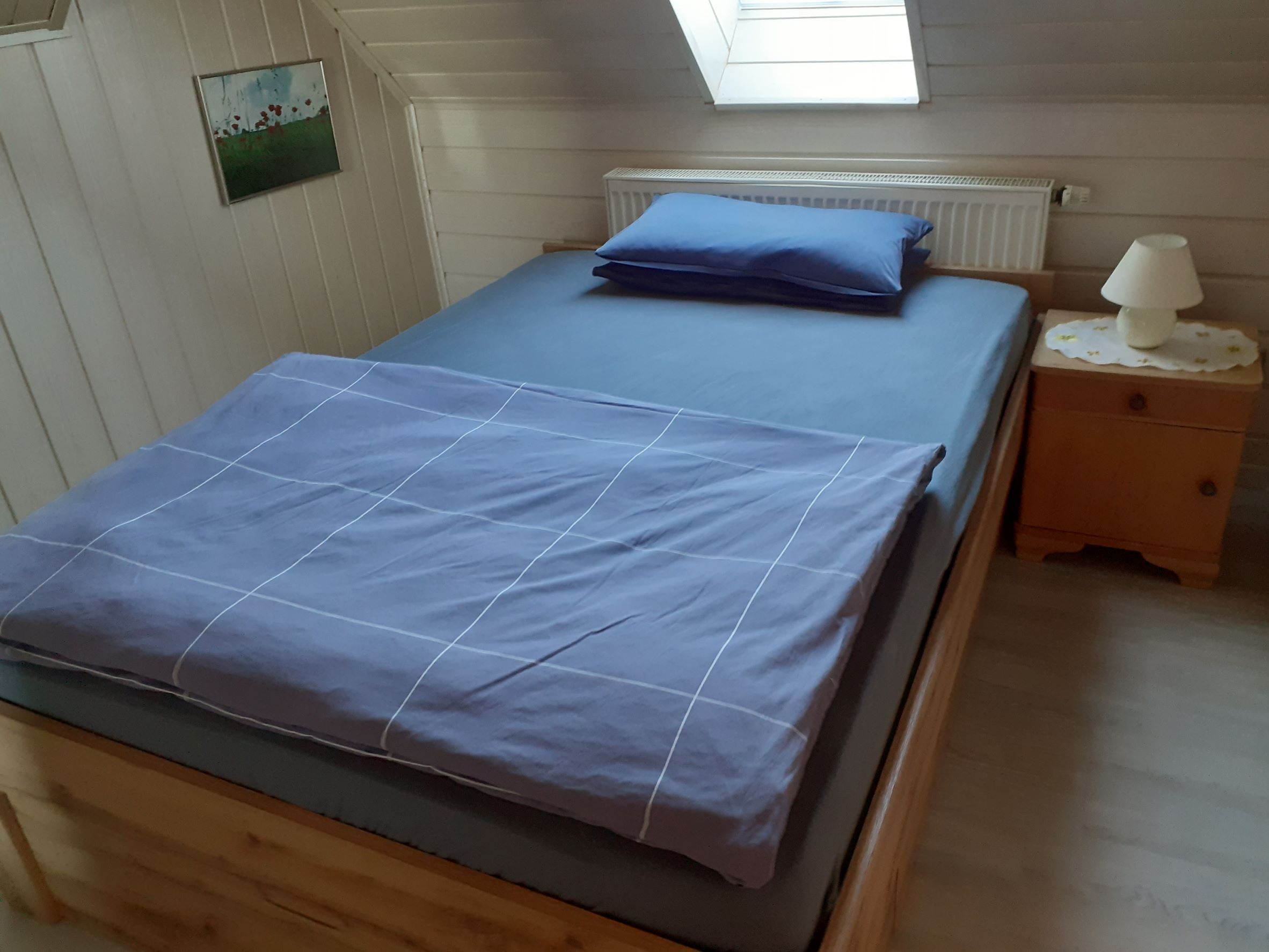 Die Ferienwohnung (67qm) befindet sich im Dachgeschoss unseres Hauses und bietet Platz für 4 Personen, mit Zustellbett sogar für 5 Personen. Sie verfügt über ein Schlafzimmer mit französischem Bett (1,40 x 2m )mit Flachbild-TV, und ein Wohn-Schlafzimmer mit 2Einzelbetten (die man auch zu einem Doppelbett zusammen stellen kann ) und Sitzbereich mit Flachbild-TV. Die komplett ausgestattete Küche mit Geschirrspüler, Kühlschrank, Herd, Backofen, Wasserkocher und Toaster lässt keine Wünsche offen. Einem geräumigen Badezimmer mit Dusche, WC, Waschtisch mit großem Spiegel, Fön und Handtuchtrockner rundet das Gesamtbild ab. Eine kleine Sitzgruppe und Parkmöglichkeit befindet sich vorm Haus. Bettwäsche und Handtücher sind vorhanden.