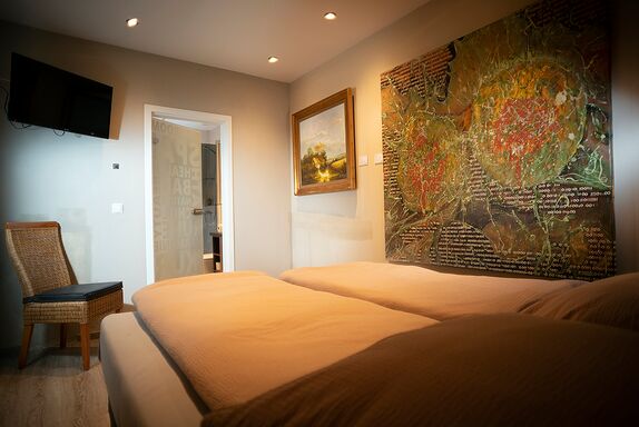 Schnuckeliges DZ mit geräumiger Dusche/WC, hochkomfortablem Boxspringbett, Ablage und Kleiderschrank, TV, im Vorzimmer befinden sich eine Sitzecke, Schreibtisch und eine vollständig ausgestattete Küchenzeile. Ideal für den Kurzurlaub am Main oder den Geschäftsreisenden, der längere Zeit vor Ort seiner Arbeit nachgehen will.