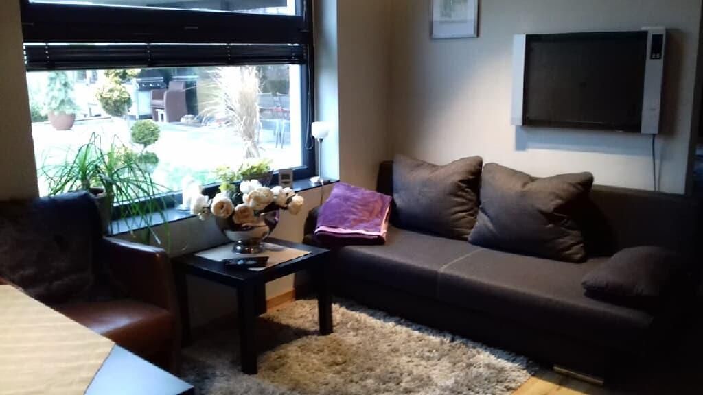 Die Ferienwohnung verfügt auf 35qm über einen Wohnbereich mit ausgestatteter Küchenzeile, Essecke, Schlafcouch und Fernseher. Der Fußboden ist mit Echtholzparkett in Eiche ausgelegt. Das Schlafzimmer ist mit einem Boxspringbett für 2 Personen ausgestattet. Im Badezimmer finden Sie eine ebenerdige Dusche, WC und Fön. Zudem gelangen Sie durch das Badezimmer ins Ankleidezimmer. Die Betten sind bezogen bei Anreise, Handtücher vorhanden. Auf der großen gemütlichen Terrasse mit Gartenmöbeln können Sie den Tag ausklingen lassen.