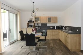 Die moderne, voll eingerichtete Küche beinhaltet neben den üblichen Elektrogeräten wie Geschirrspüler, Mikrowelle und Backofen auch einen Toaster, einen Wasserkocher, eine Kaffeevollautomaten (ganze Bohnen stehen bereit), einen Trinkwassersprudler sowie genügend Geschirr für alle anwesenden Urlauber.