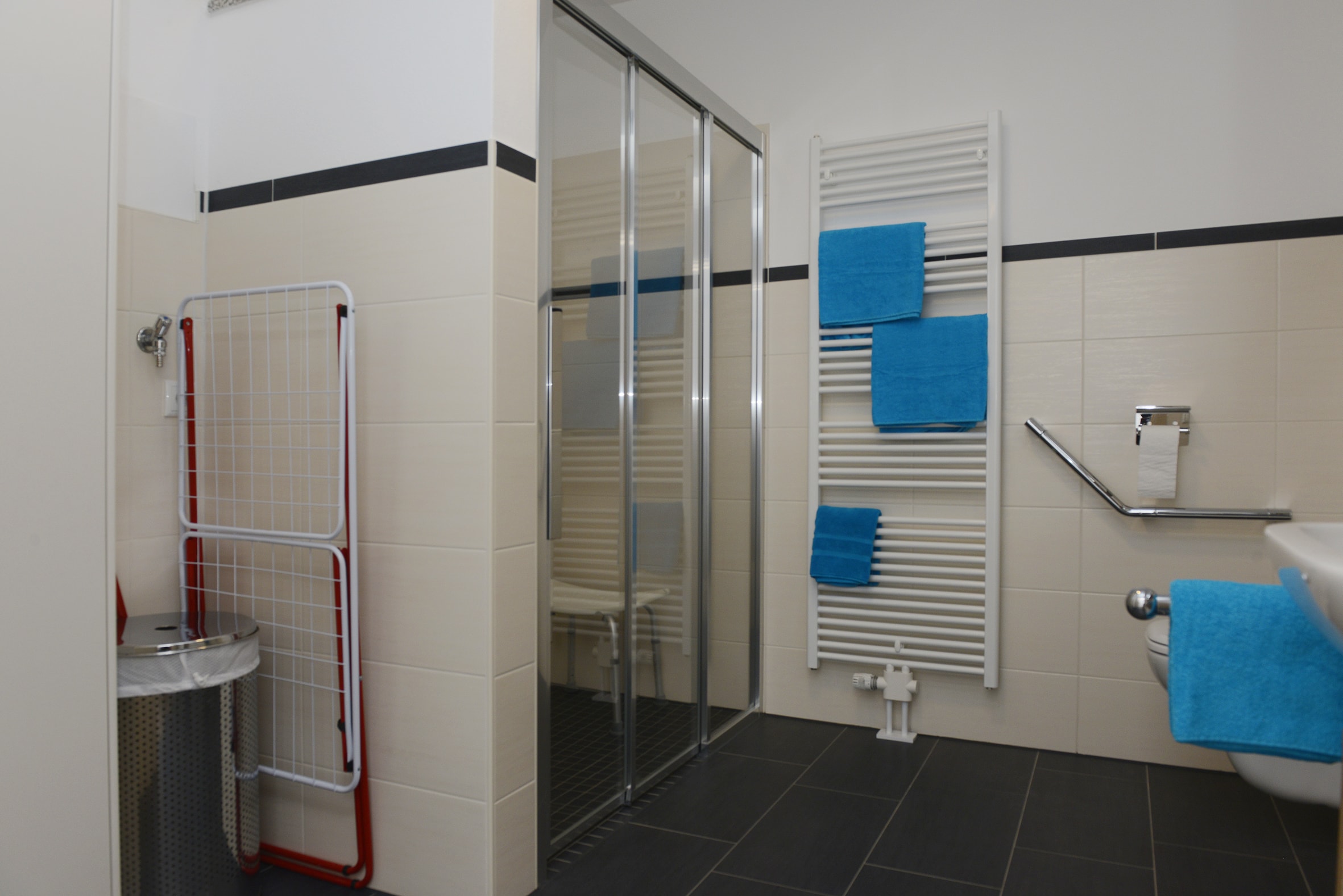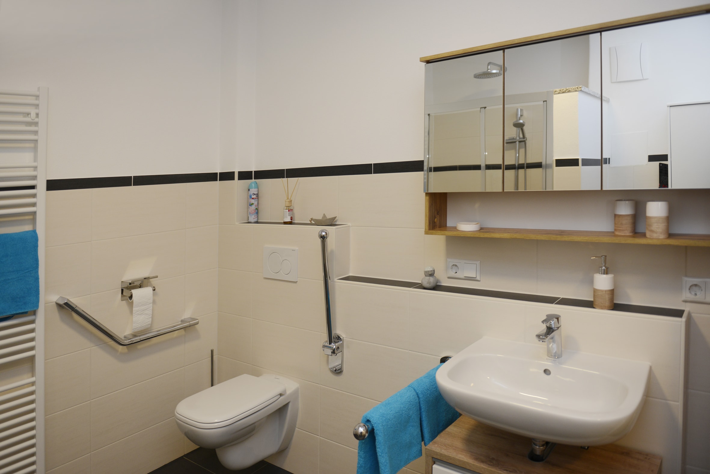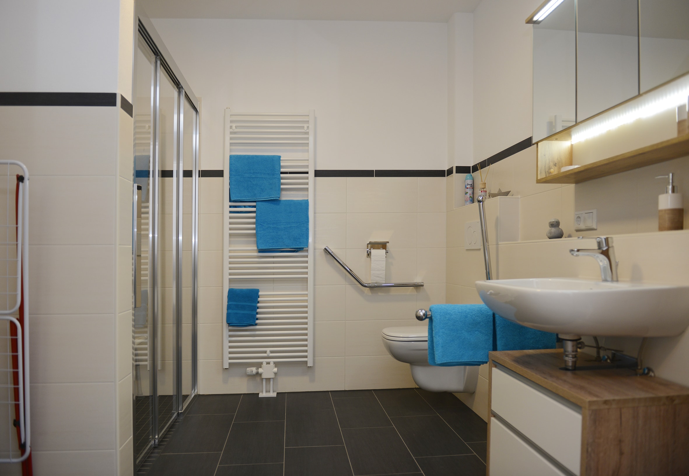 Wie schon mehrfach erwähnt, handelt es sich um eine barrierefreie und bedingt rollstuhlgerechte Wohnung. Hierzu gehört natürlich auch ein extrabreiter, barrierefreier Zugang zur Dusche, sowie Haltegriffe an der Toilette und dem Waschbecken.