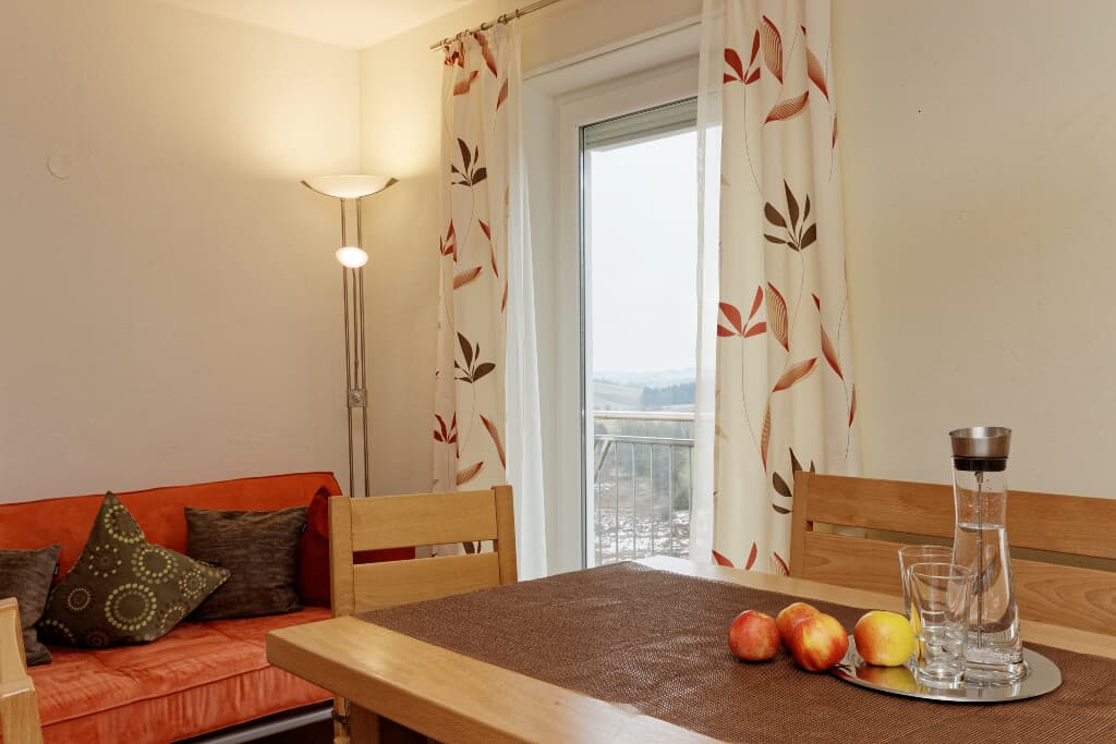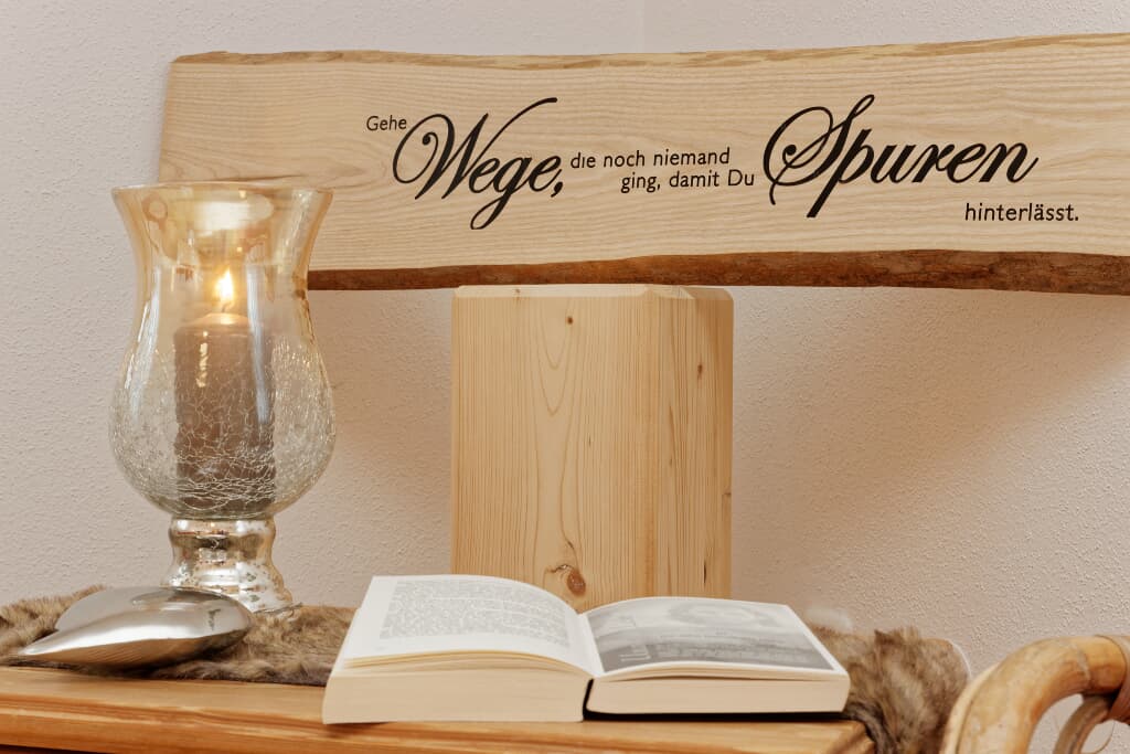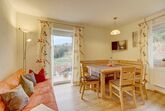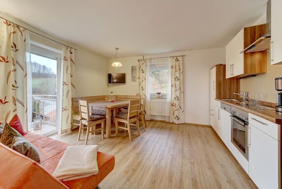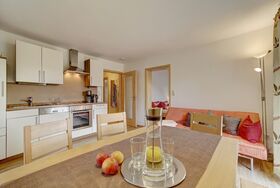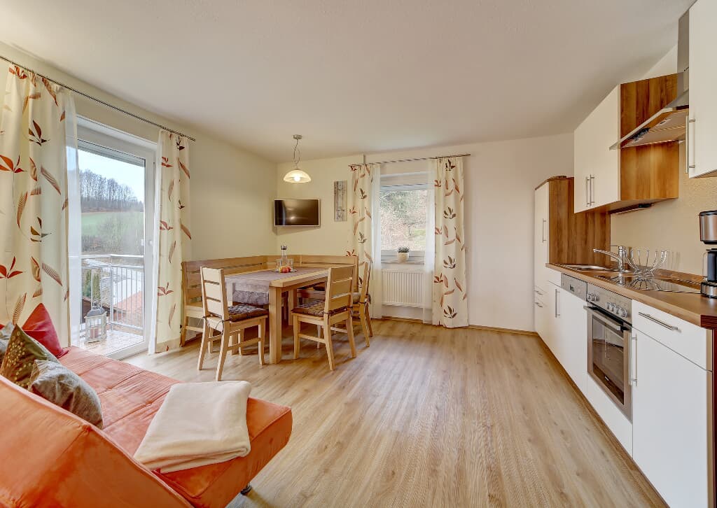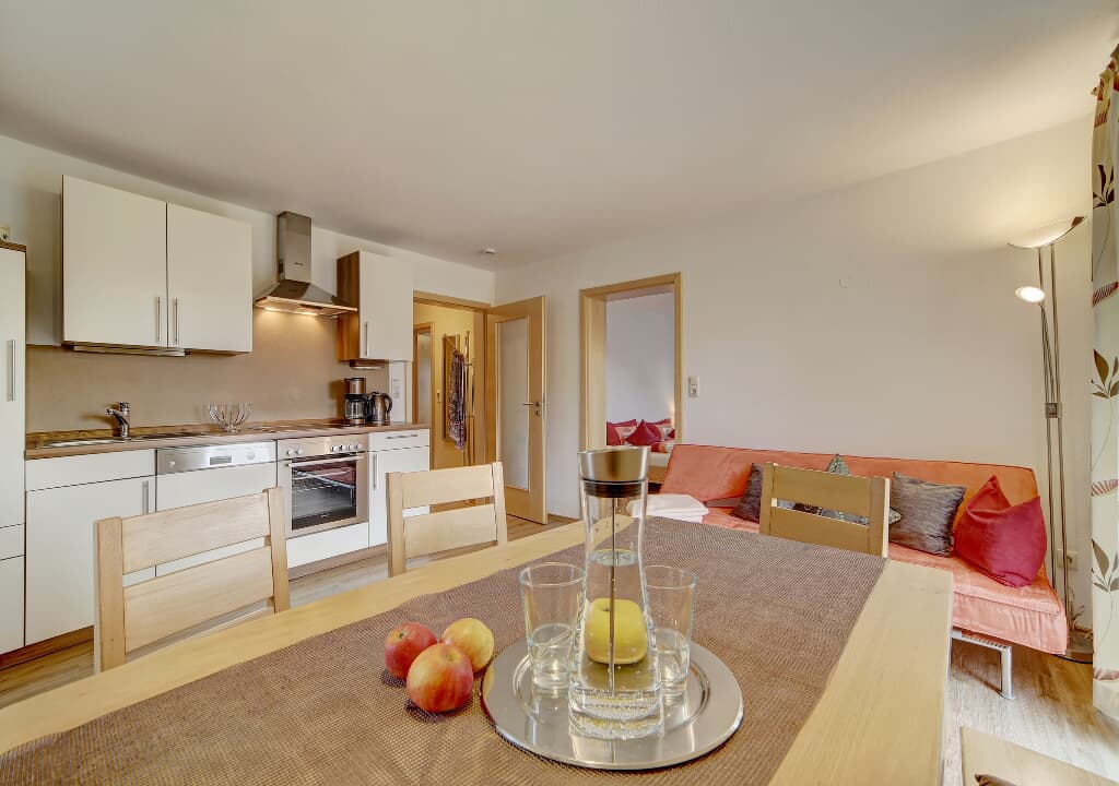 An der massiv geschreinerten Essecke in der Wohnküche können 4- 6 Personen gemeinsame Zeit verbringen. Hier kann die ganze Familie gemütlich sitzen und ereignisreiche Urlaubstage ausklingen lassen.