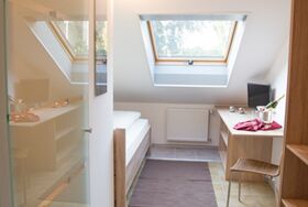 Gehobene Ausstattung mit HD-Flachbildschirmfernseher und Schreibtisch, Bad mit WC, Dusche und Waschbecken, Handtücher und Föhn bekommen Sie von uns. WLAN im Zimmer verfügbar. Alle Zimmer mit Außenrollos.