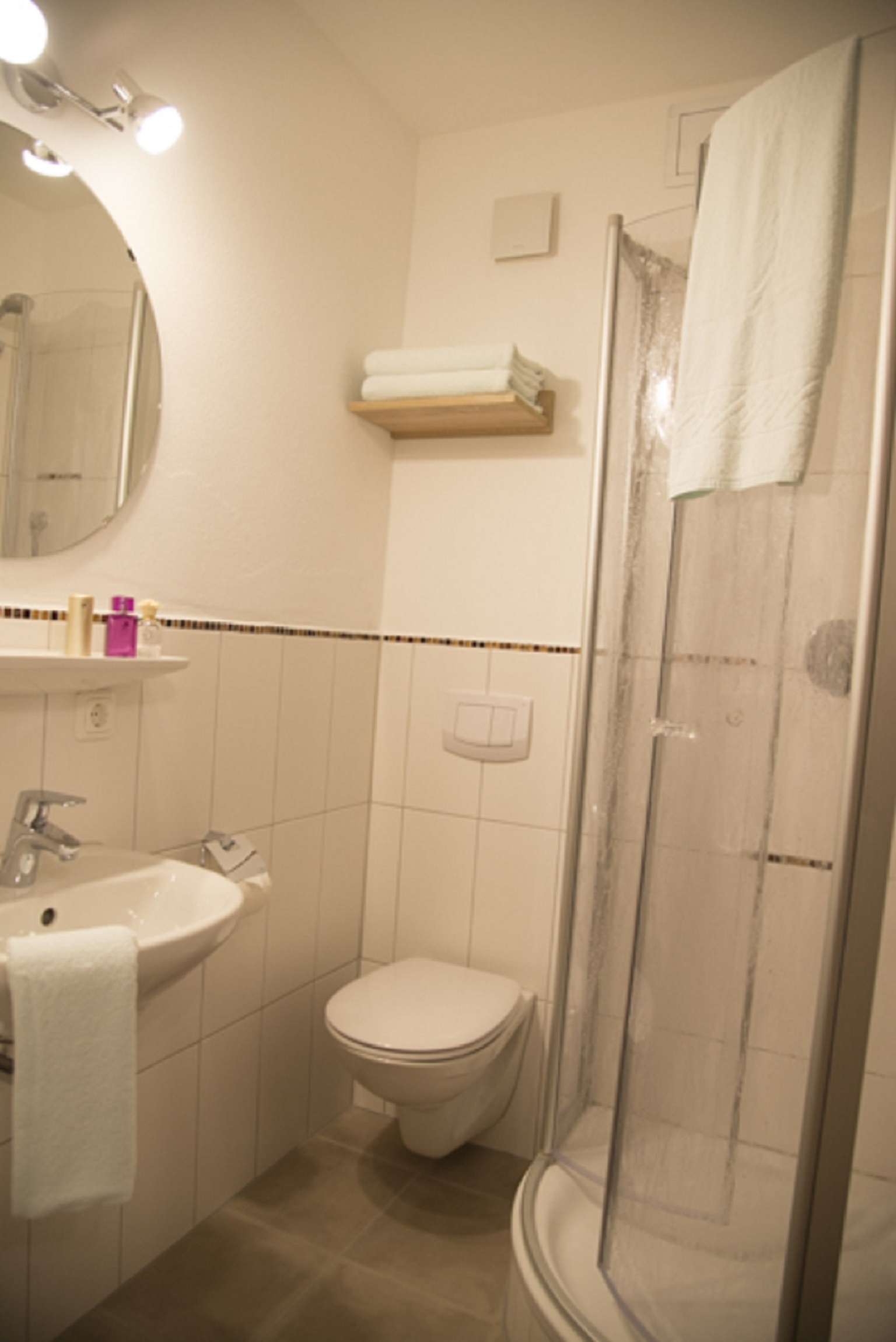 Gehobene Ausstattung mit HD-Flachbildschirmfernseher und Schreibtisch, Bad mit WC, Dusche und Waschbecken, Handtücher und Föhn bekommen Sie von uns. WLAN im Zimmer verfügbar. Alle Zimmer mit Außenrollos.