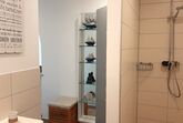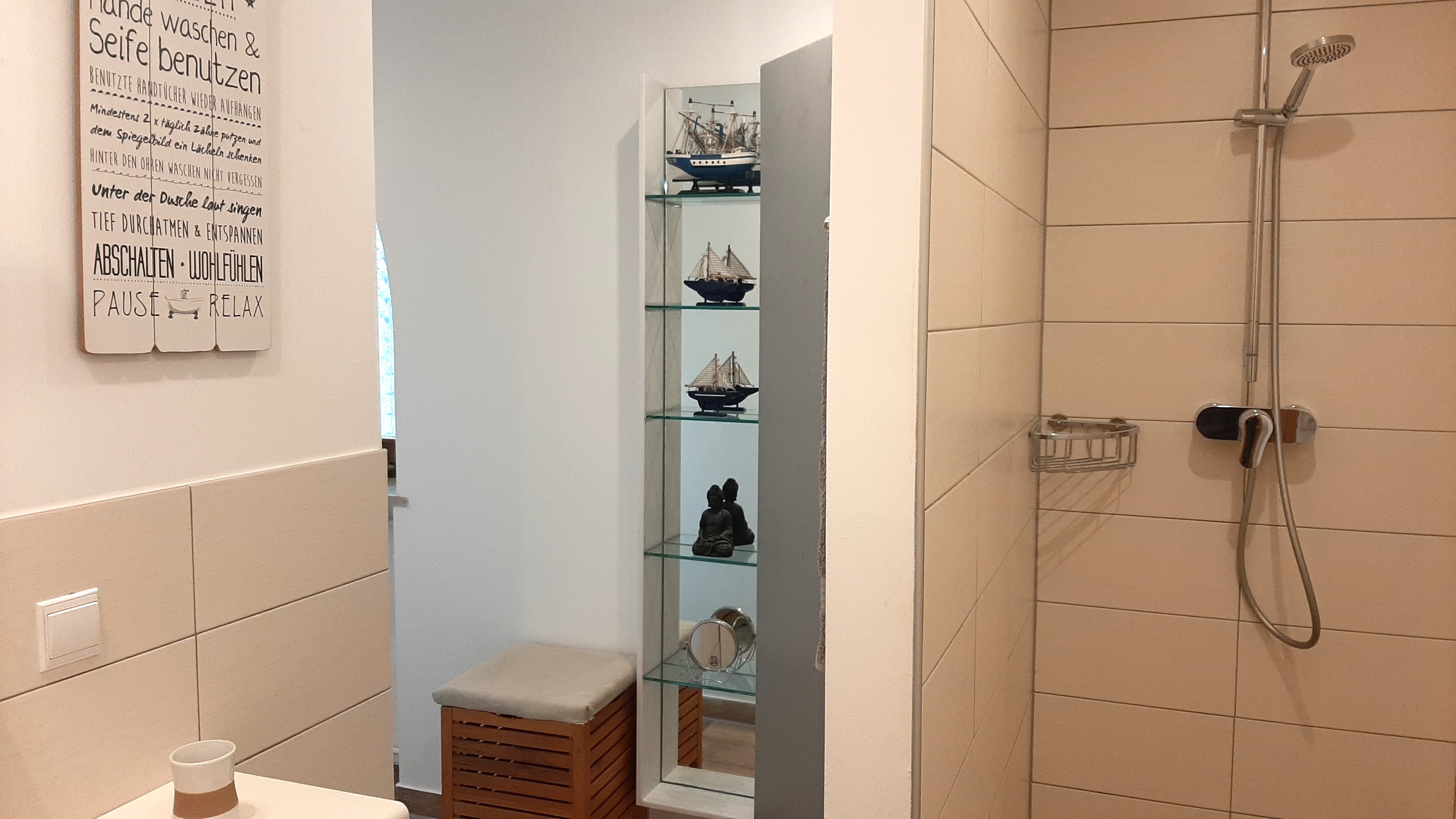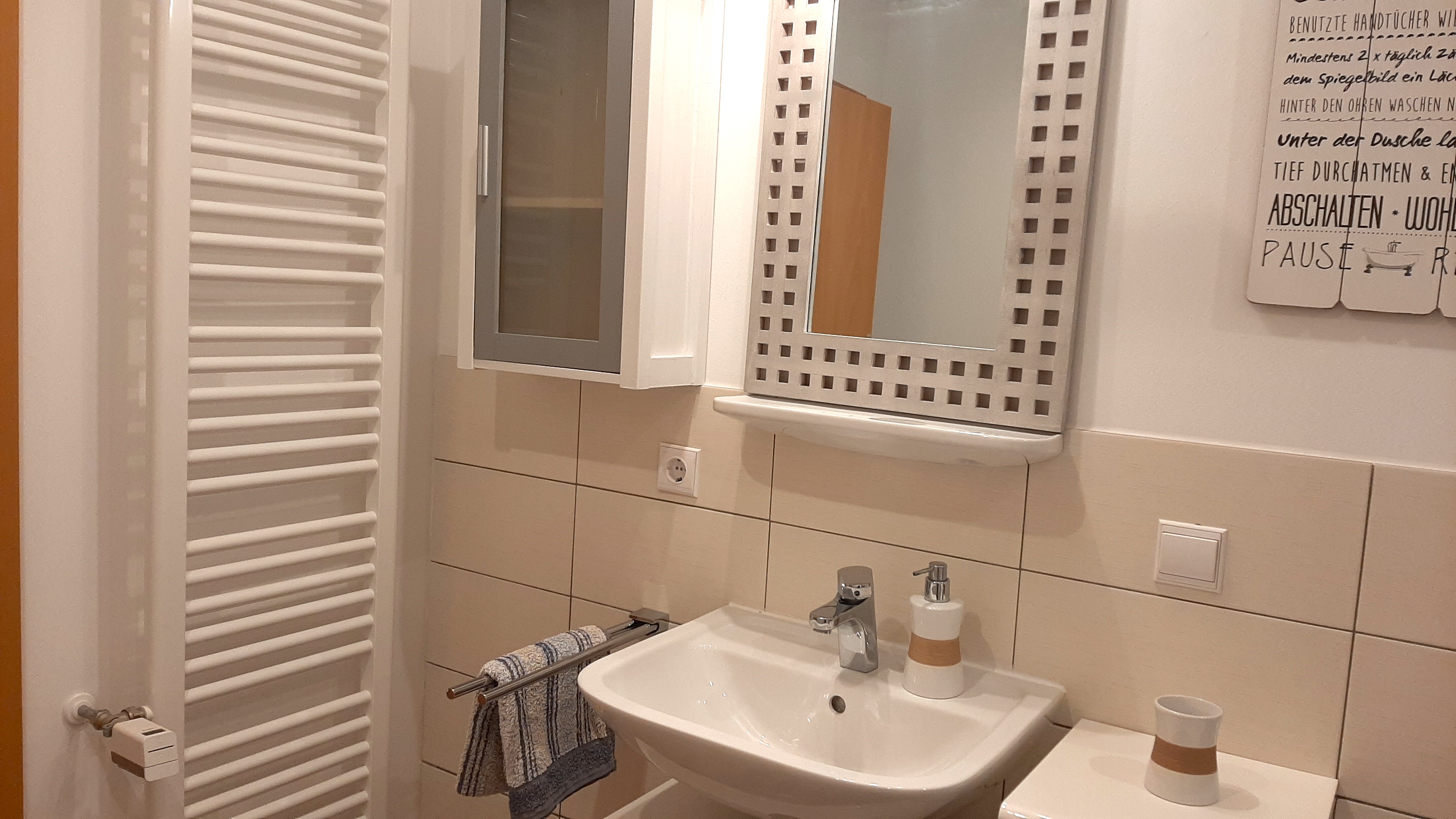 Das Badezimmer (9 m²) mit ebenerdiger Dusche, WC und Waschbecken, ein Handtuchheizkörper, Fön, Handtücher sind ebenfalls mit inbegriffen.