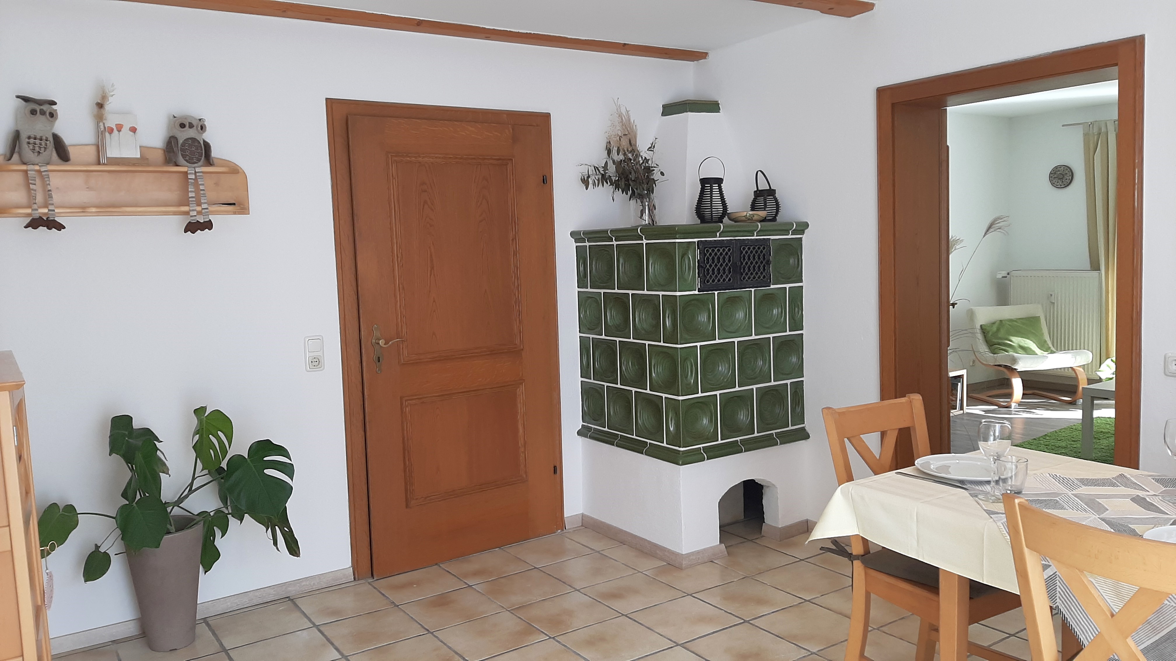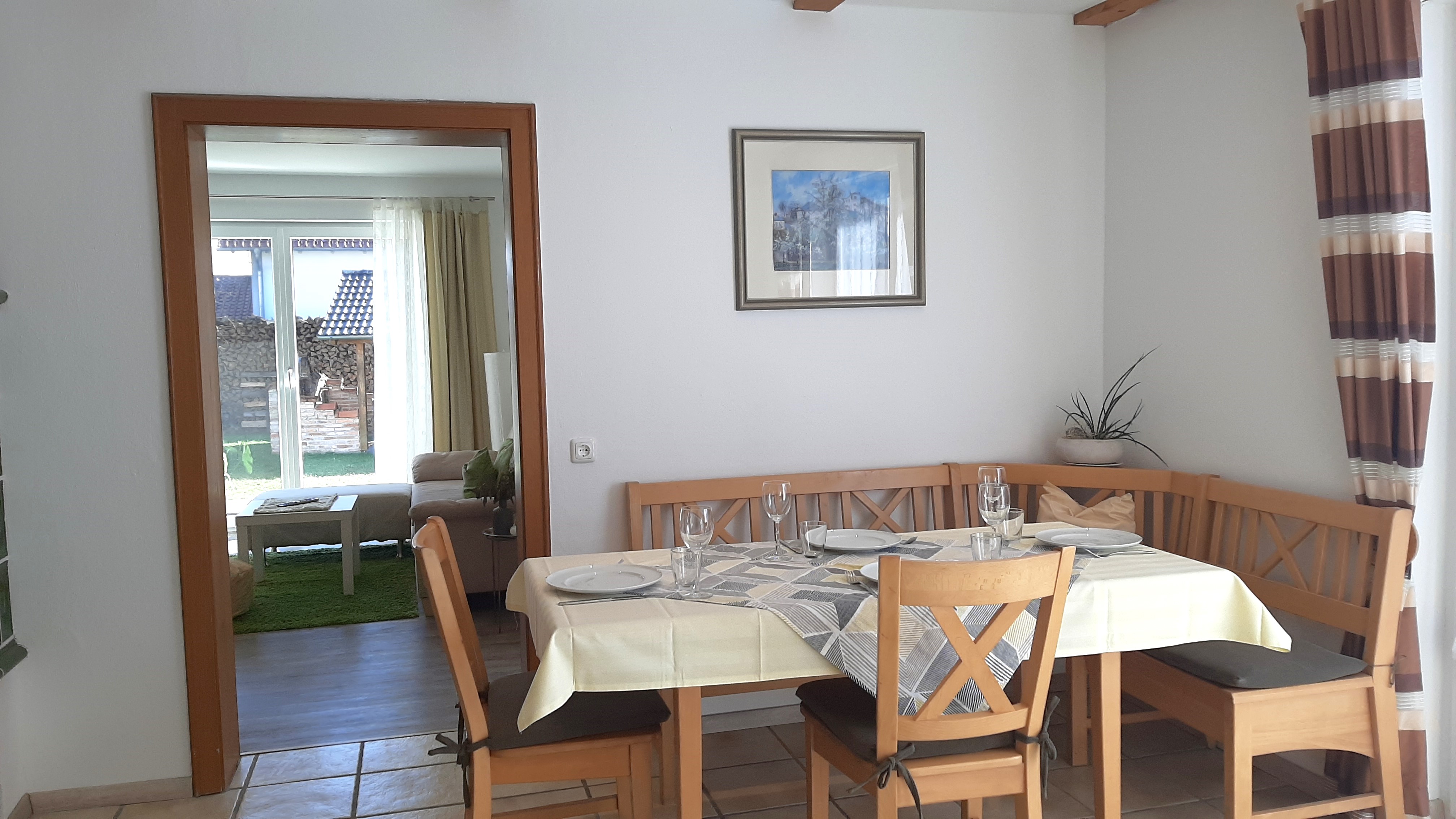 Der Essbereich( 16m²) mit Kachelofen, einer großen, gemütlichen Eckbank lädt Sie zum Verweilen ein. Von hier aus gelangen Sie auf die überdachte Terrasse mit Sitzecke.
