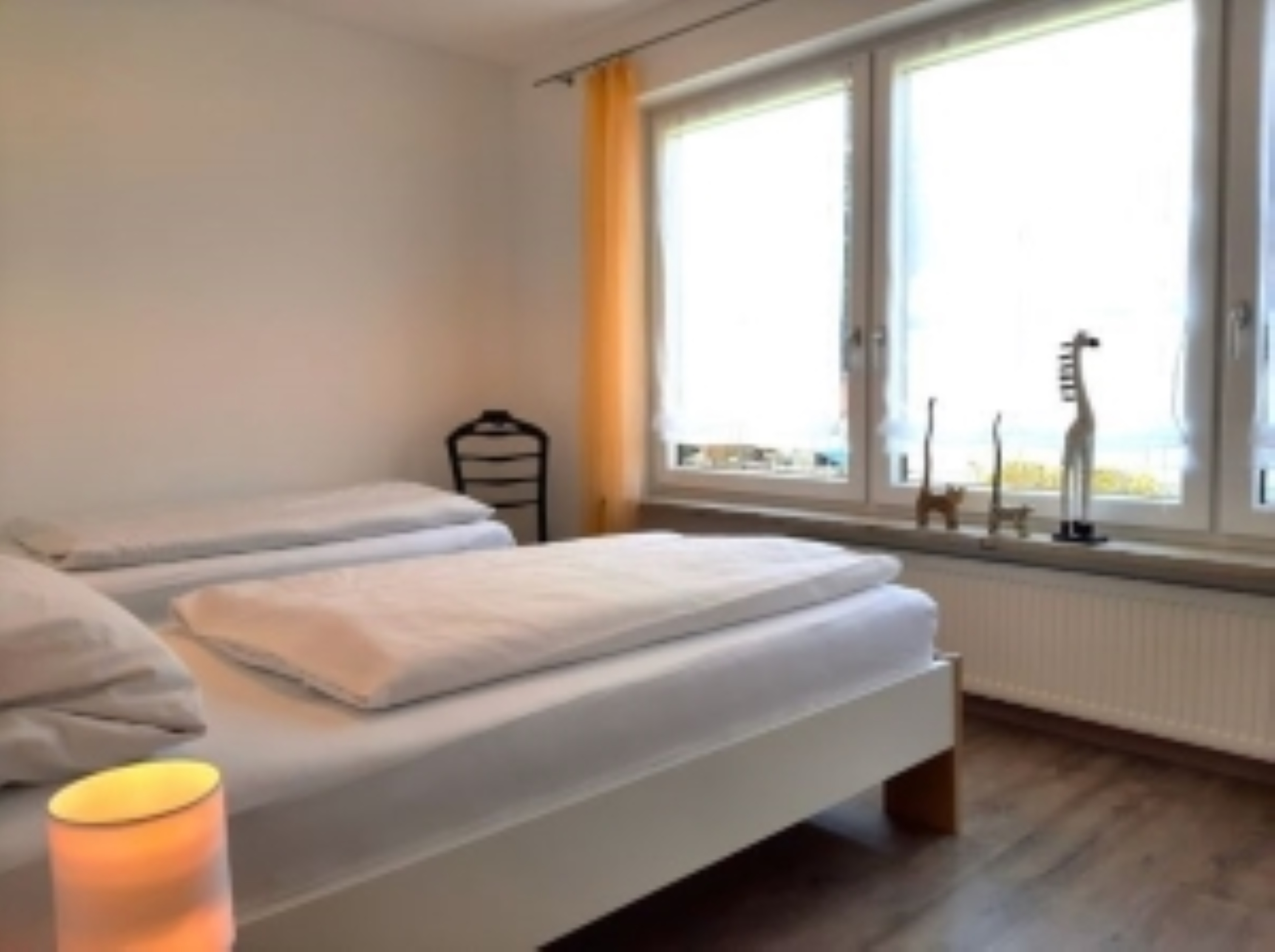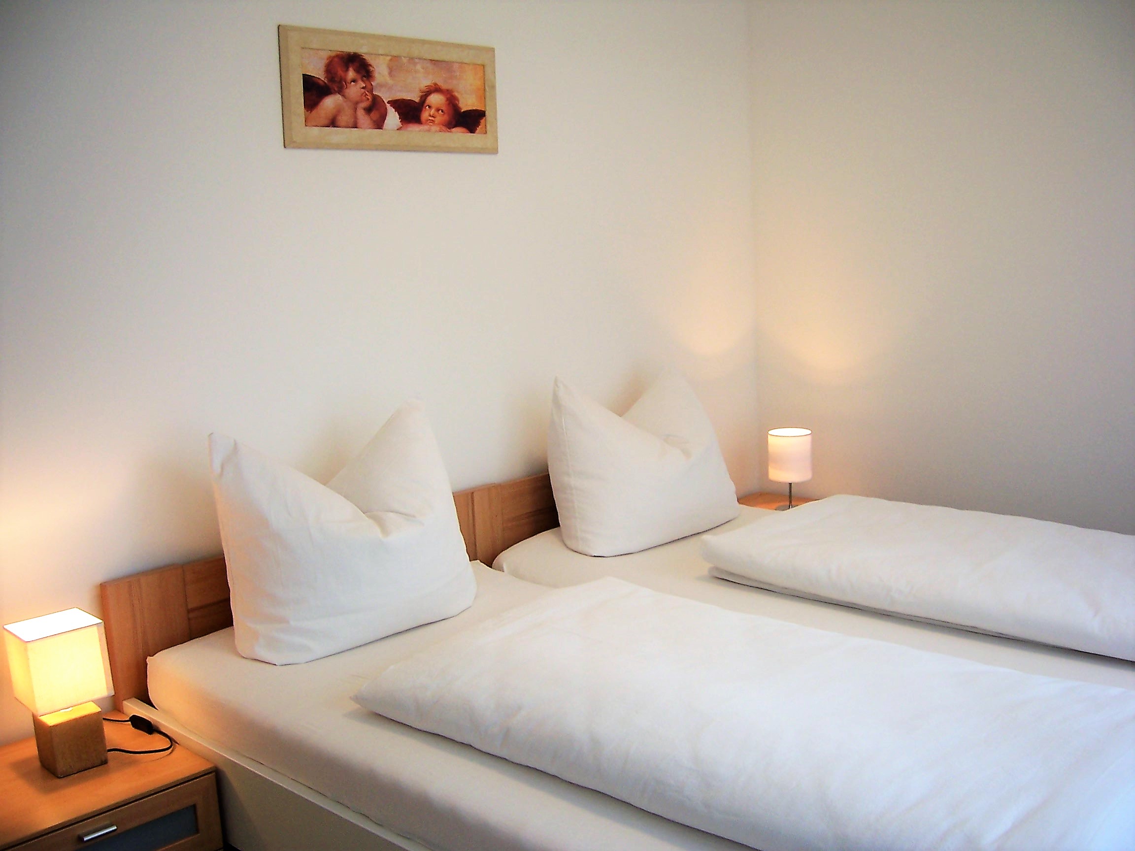 Vom Wohnzimmer aus gelangen Sie noch in ein kleines Schlafzimmer, etwa 14 m² groß, dies ist mit 2 Einzelbetten ausgestattet, die jederzeit voneinander getrennt aufgestellt werden können.
