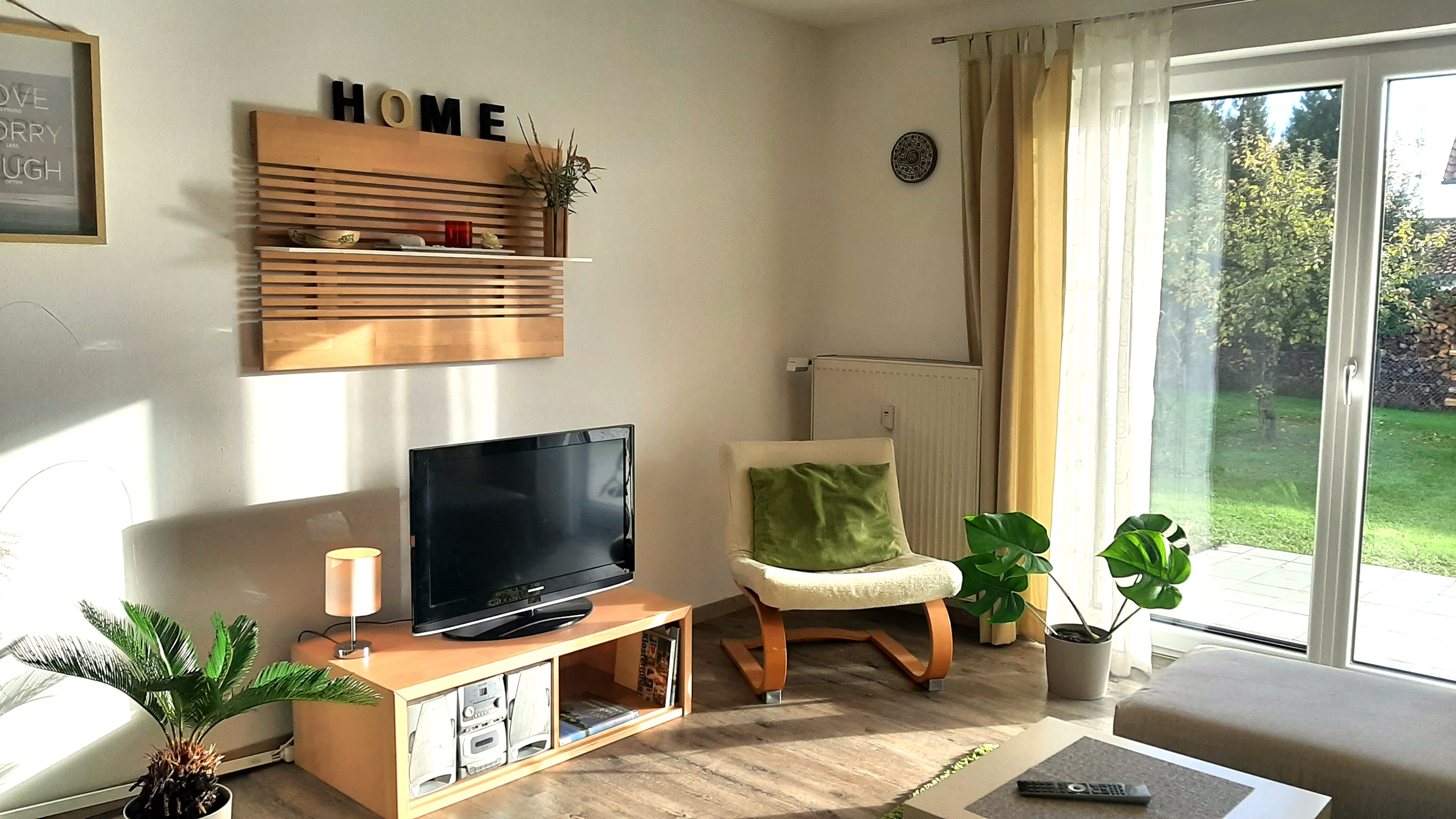 Das helle Wohnzimmer misst 16 m², ist modern eingerichtet. Über die Terrassentür gelangt man in den hinteren Garten, hier befindet sich eine Möglichkeit zum Grillen.