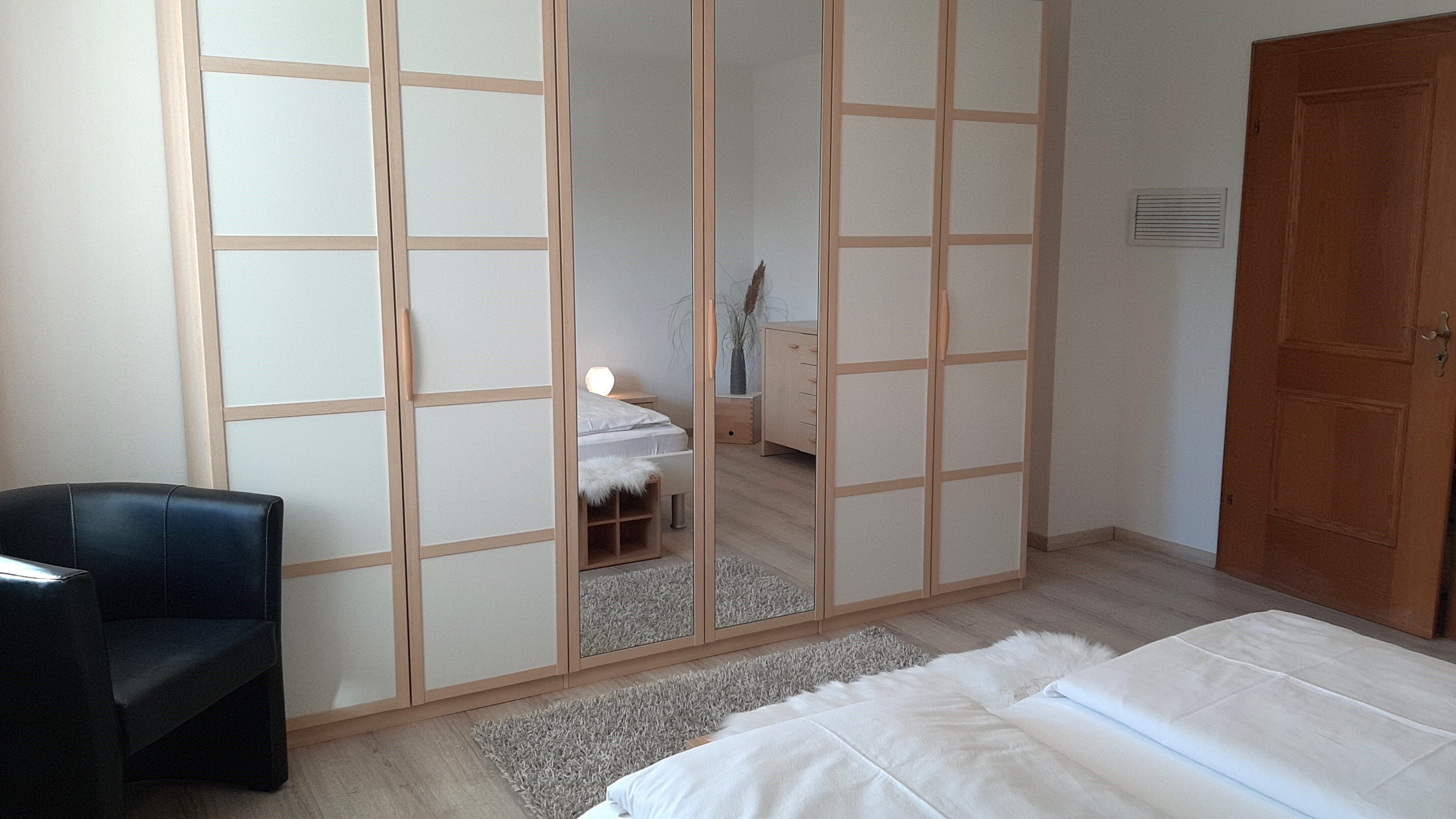 Ein großes Schlafzimmer von 18 m², mit einem Doppelbett, 6-türigem Schrank mit Spiegel. Nachtkästchen und Kommode sorgen für einen komfortablen Aufenthalt im Zimmer.