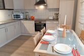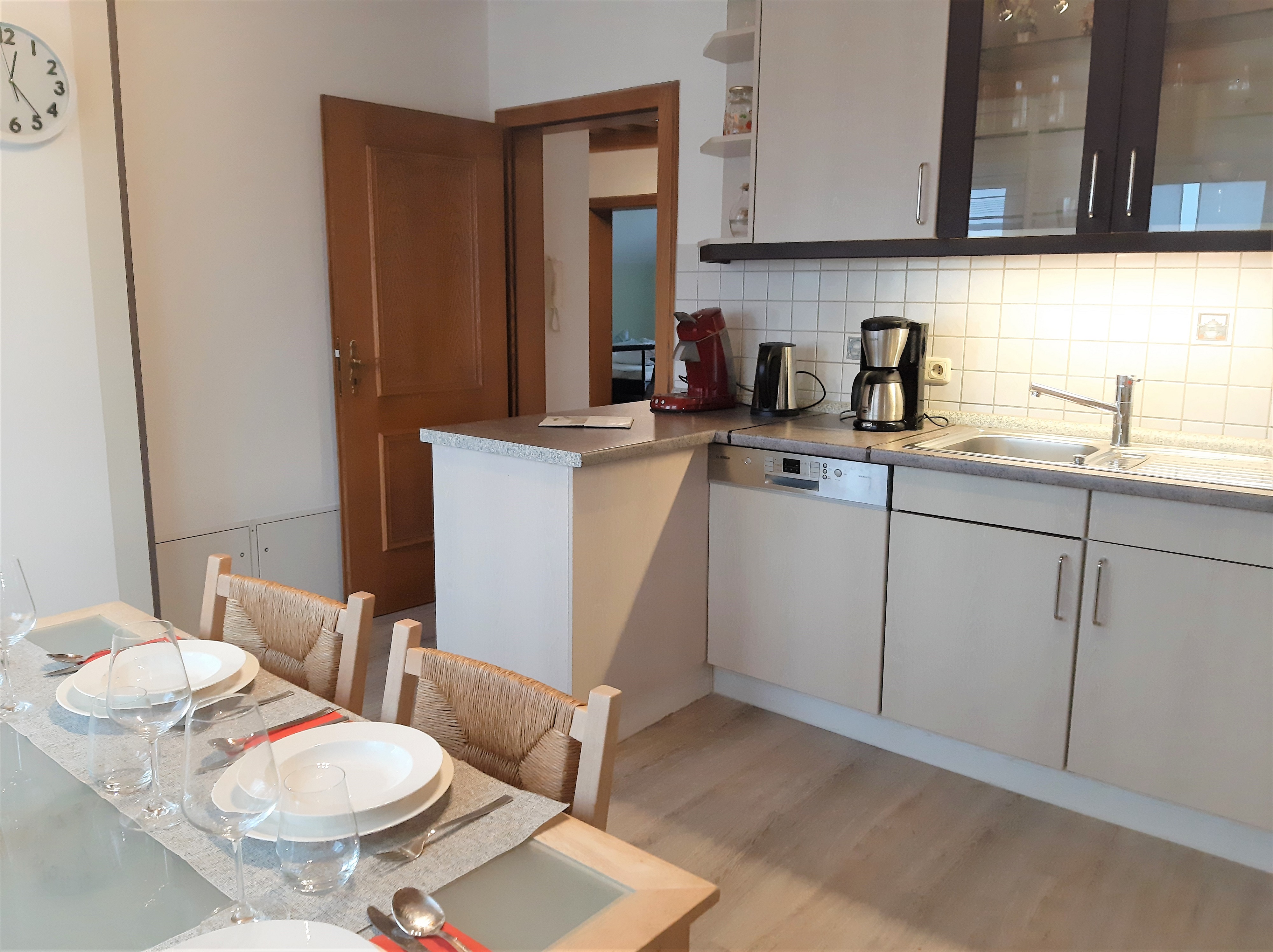 Die große Küche (15 m²)mit integriertem Essbereich. Mit einem Herd, Backofen, Kühlschrank, Mikrowelle, Dunstabzug sowie Spülmaschine ist die Küche umfangreich ausgestattet.