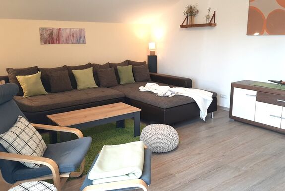 Durch eine komfortable Couchlandschaft im Wohnzimmer (30m²) bietet es sich an, die Schlafmöglichkeit auf 6 Personen zu erweitern.