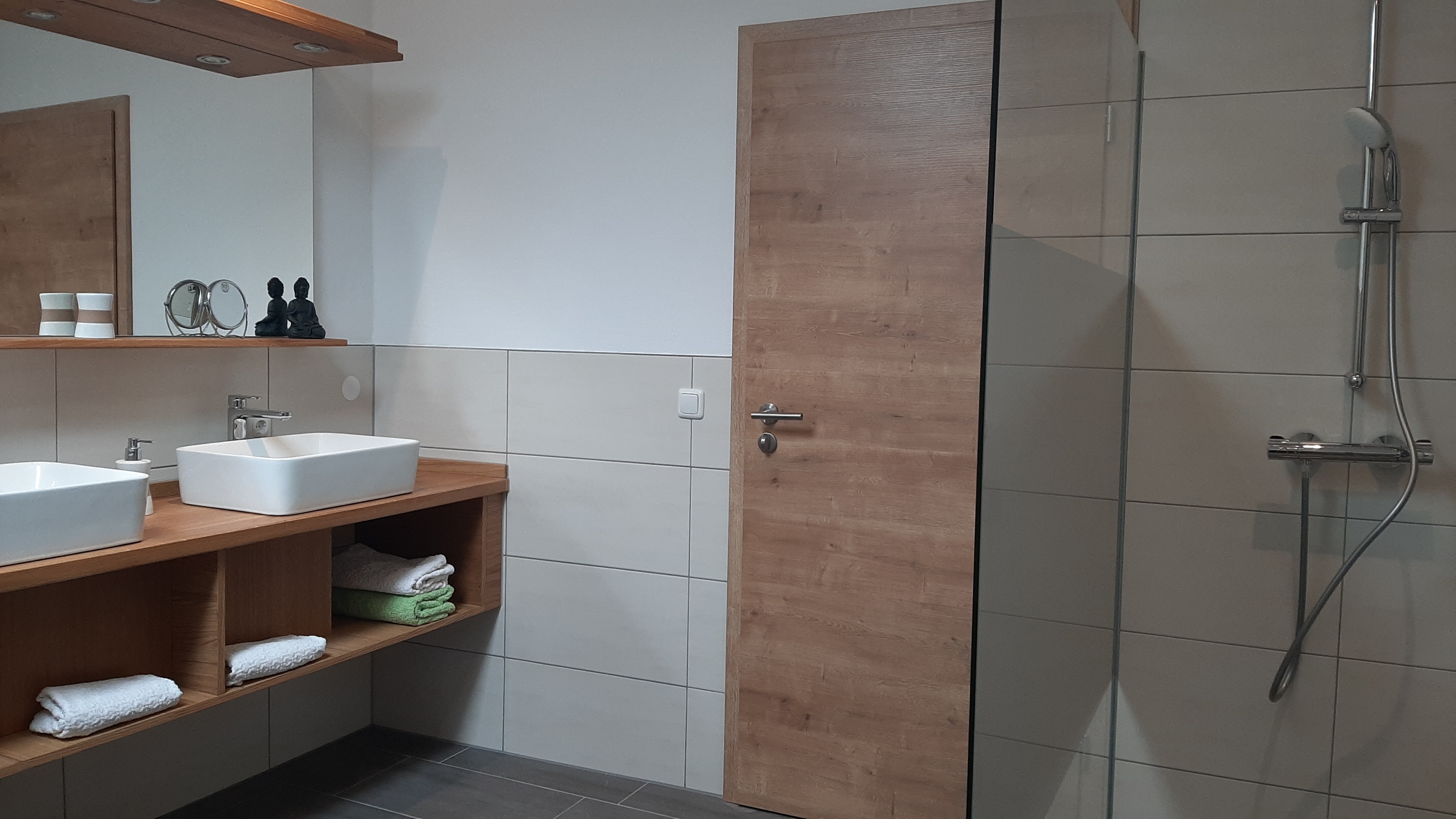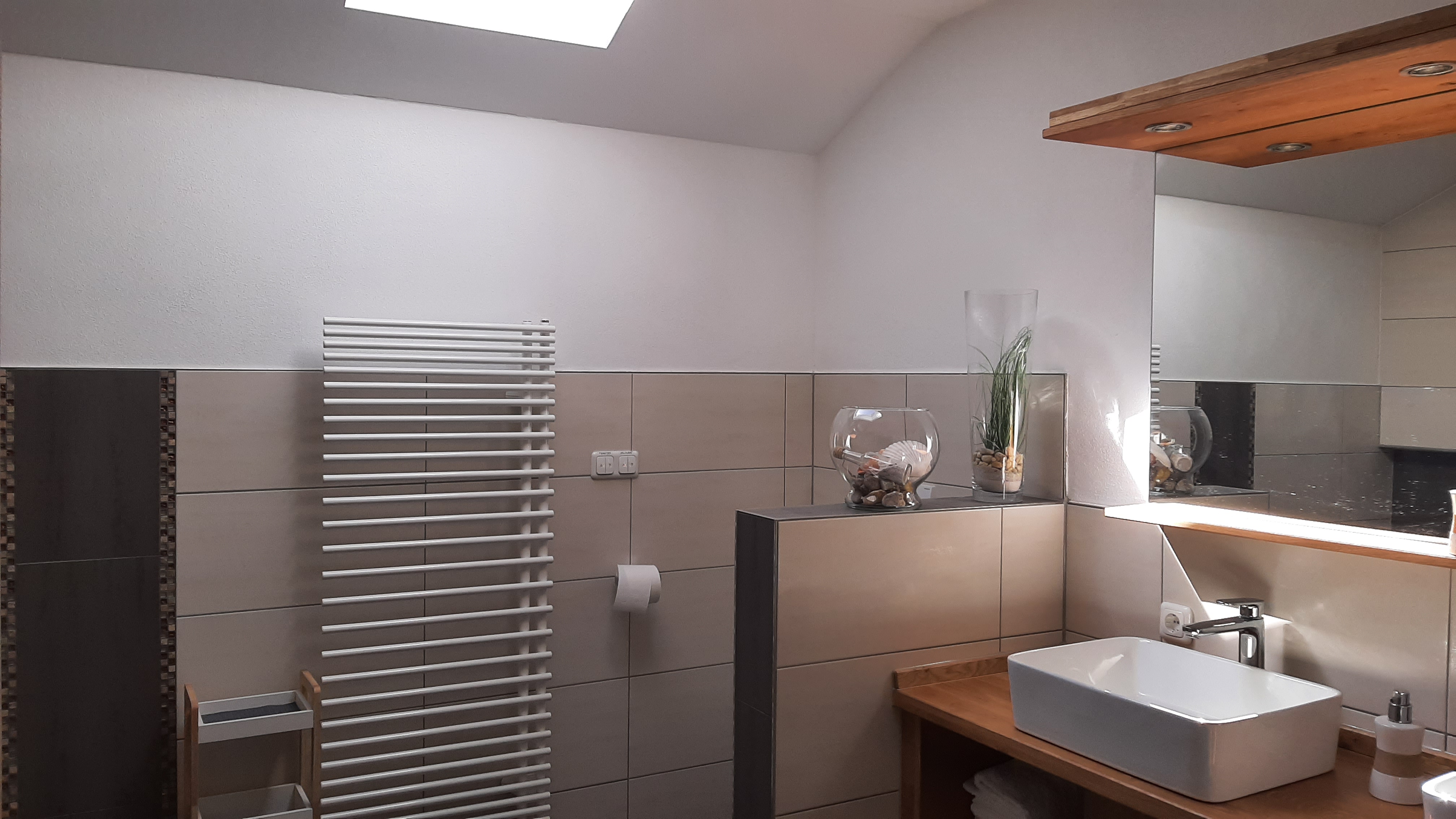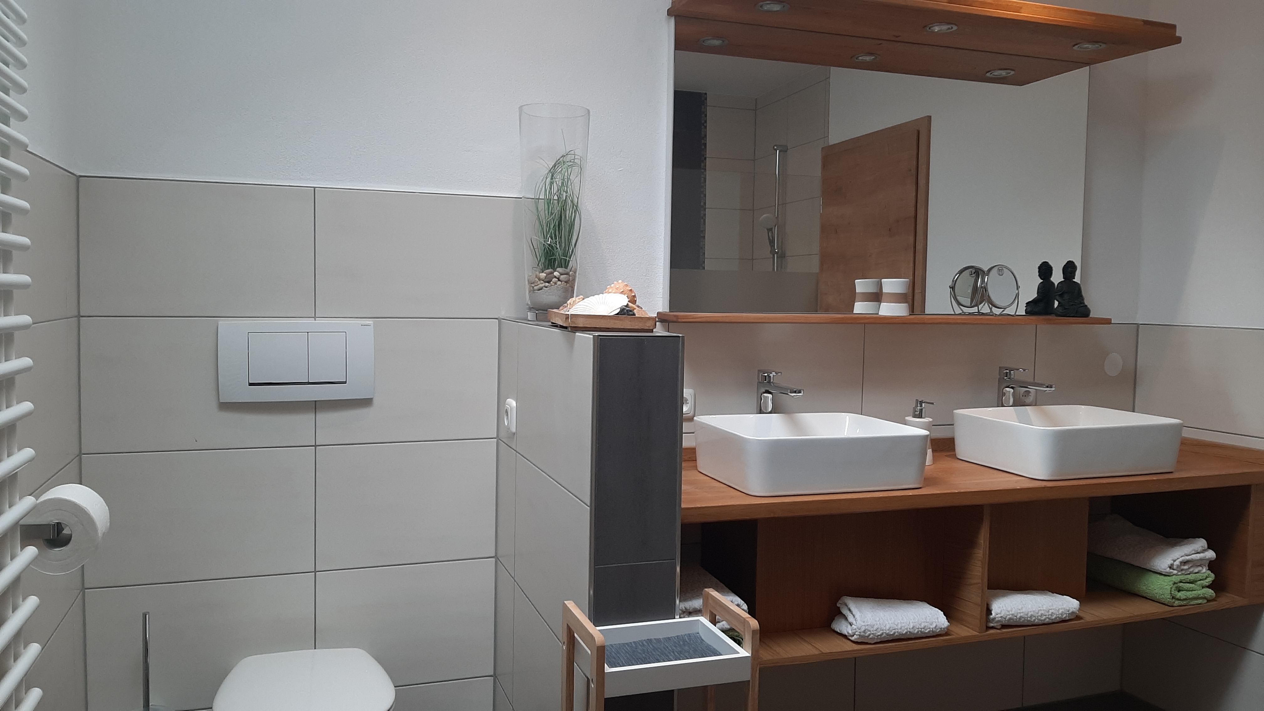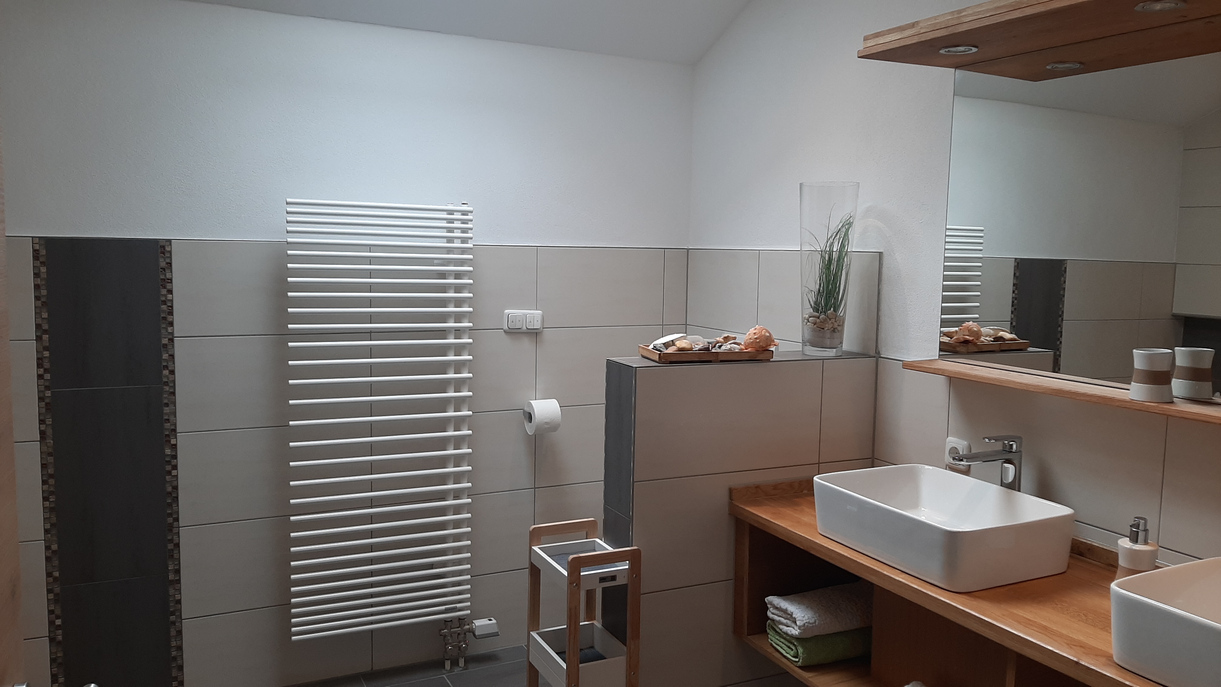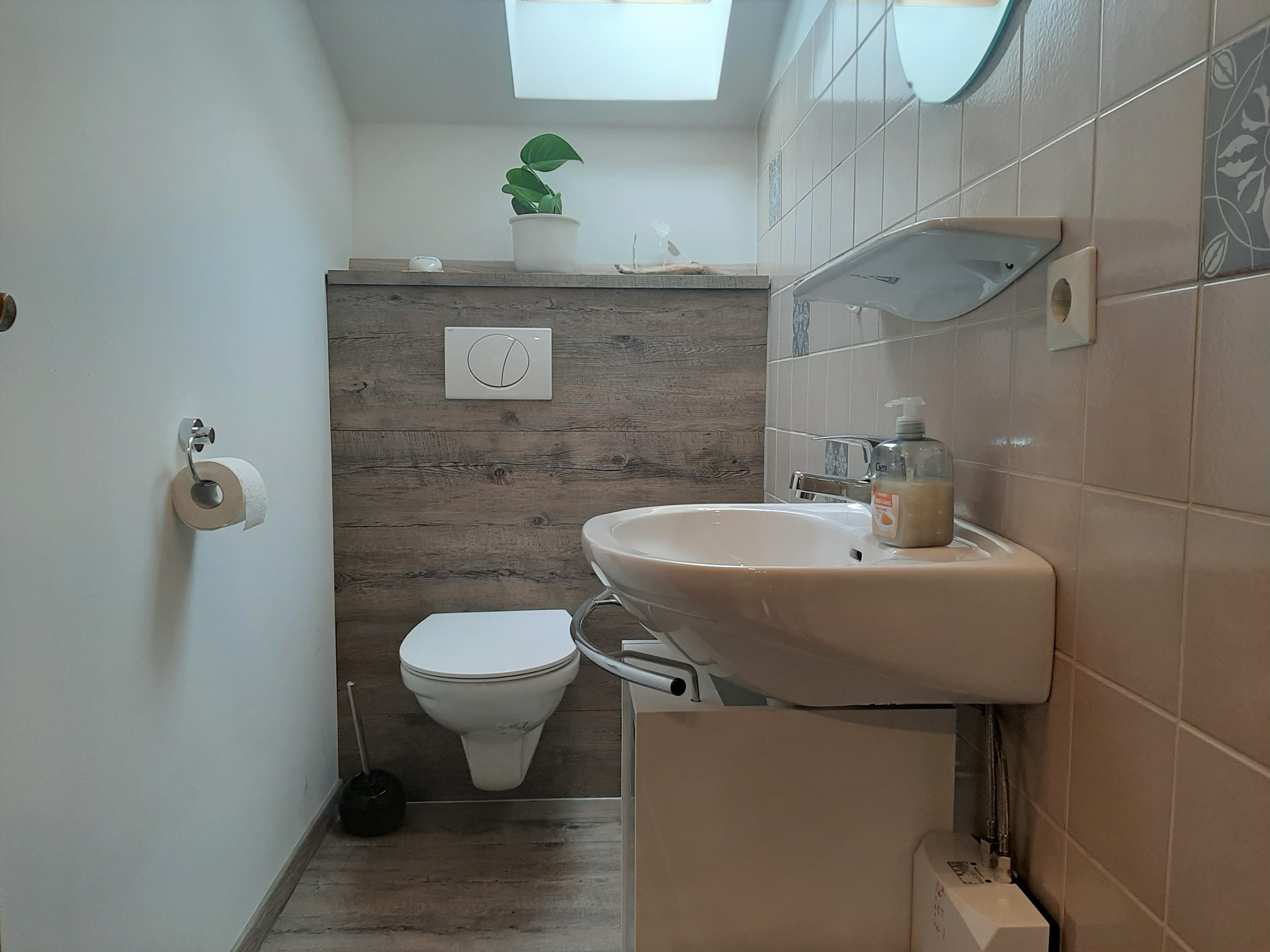 Ein Badezimmer (12m²) mit WC, Dusche, sowie ein separates WC mit Waschbecken sind in der Wohnung vorhanden. nFön, Handtücher sind selbstverständlich mit inbegriffen.