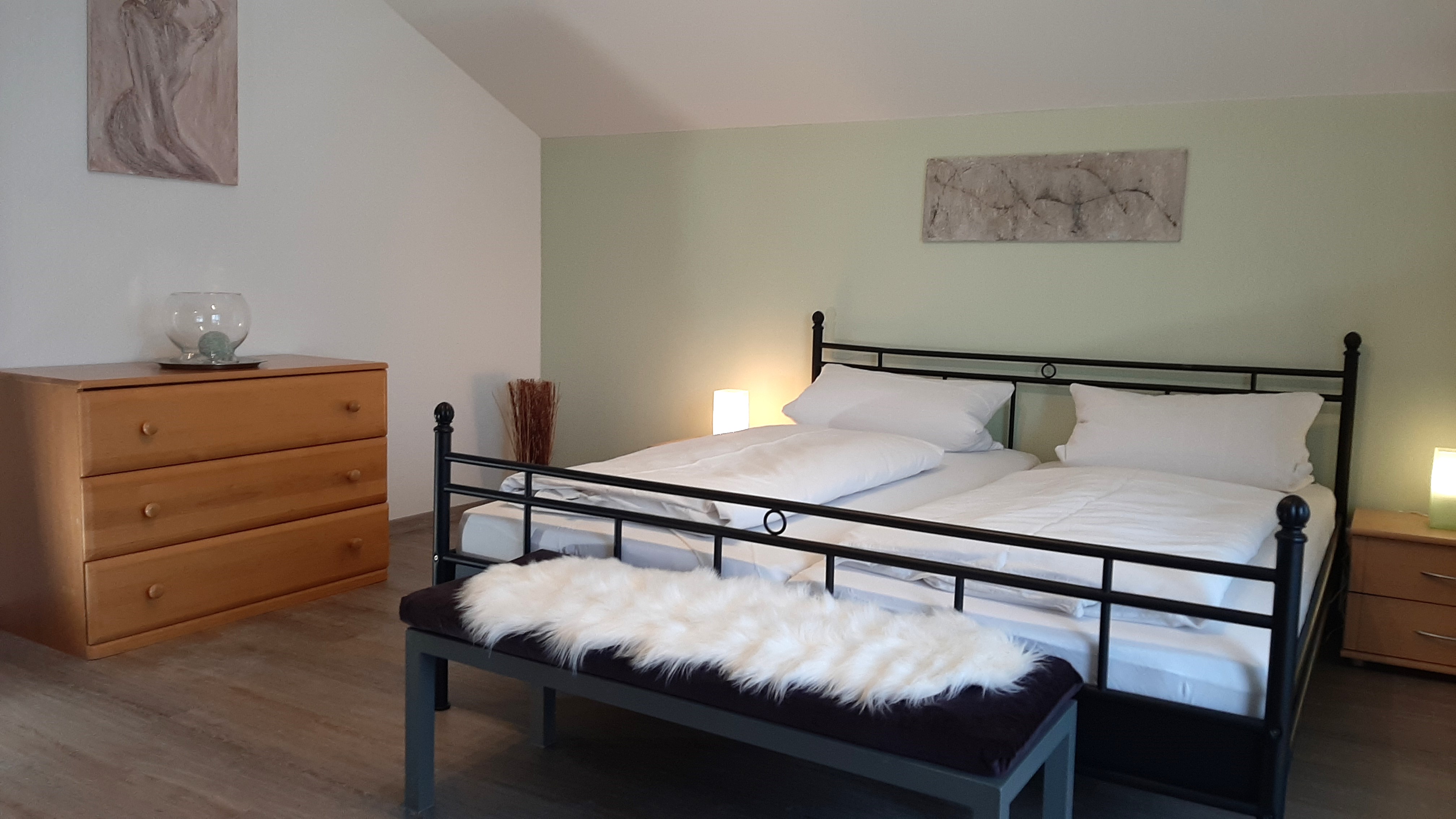 Das große Schlafzimmer (20m²) ist mit einem Doppelbett (180*200), Nachtkästchen, Schrank und Kommode ausgestattet.