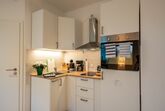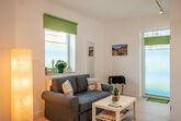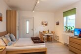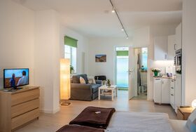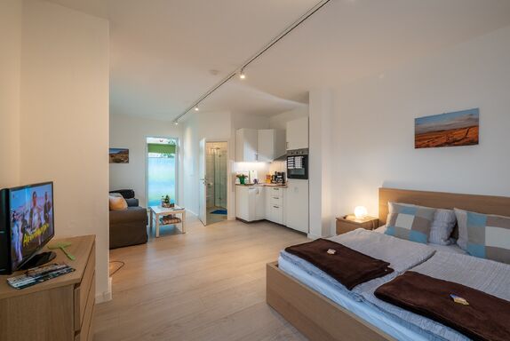 Das Wohnzimmer ist gleichzeitig Schlafzimmer mit einem Doppelbett und einem Schlafsofa (Aufbettung für 1-2 Personen möglich). Außerdem ist eine moderne Küchenzeile mit Backofen, Mikrowelle, Kaffeemaschine, Toaster, Wasserkocher und Kühlschrank und eine gemütliche Essecke vorhanden. Zusätzliche Sitzmöglichkeiten bietet das bequeme Sofa neben dem Fenster. Zur Zimmerausstattung gehören außerdem ein Fernseher und kostenloses Wlan. Das Badezimmer ist mit Dusche, WC und Föhn ausgestattet. Das Apartment befindet sich im Erdgeschoss und verfügt über eine Terrasse mit Tisch und Stühlen und Zugang zur großzügigen Gartenanlage.