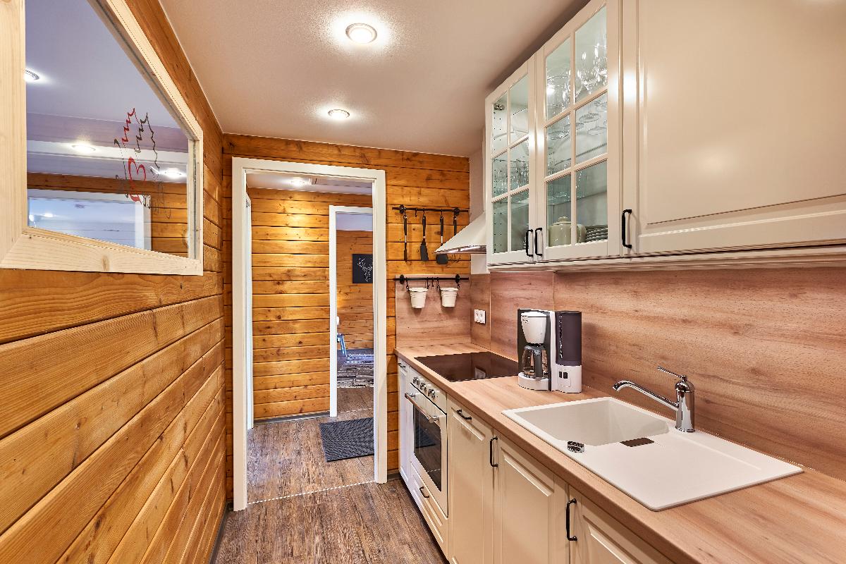 Kühlschrank mit kleinem Gefrierfach und E-Herd keine Wünsche offen. Im Bad
