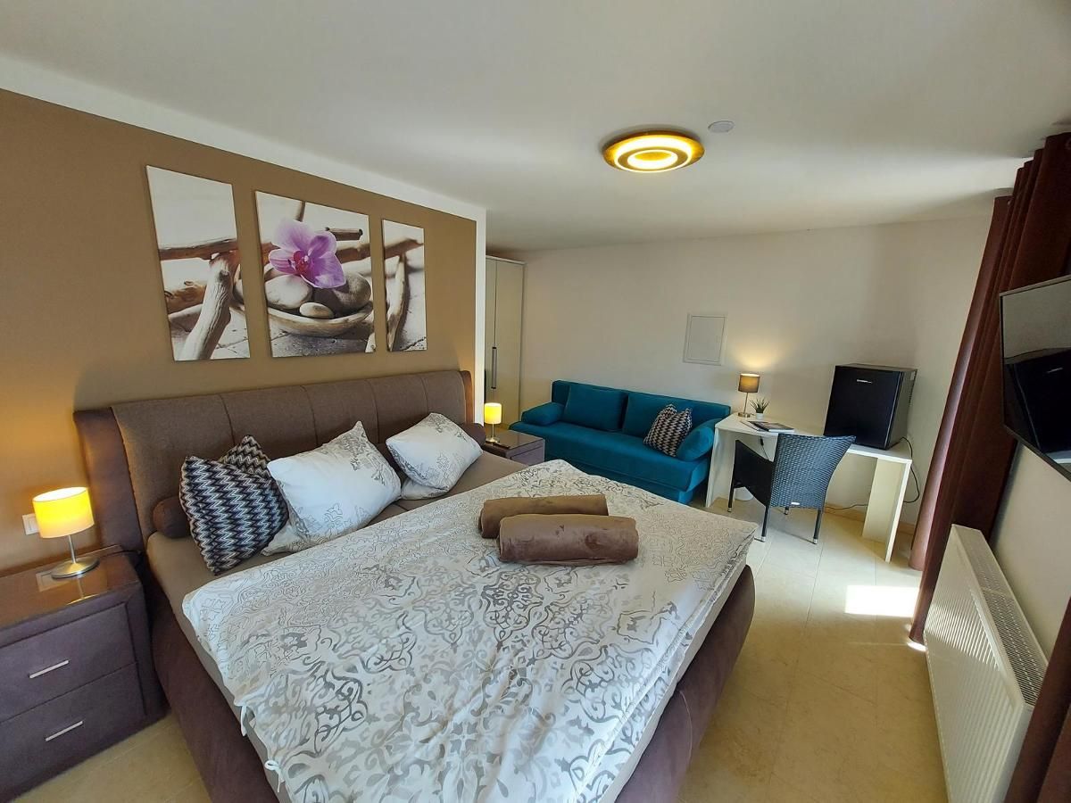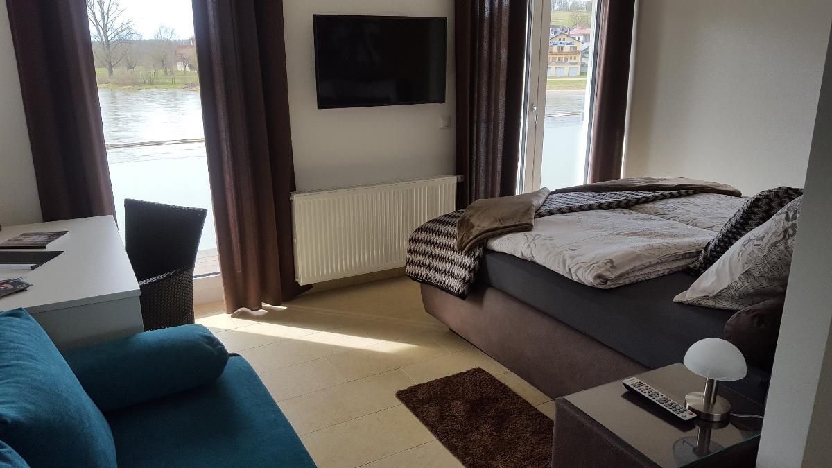 DAs Zimmer ist mit hochwertigen und exklusiven Möbeln ausgestattet. Jedes Zimmer verfügt über ein gemütliches Boxspringbett und einen Balkonanteil mit Blick auf die Donau.
