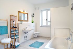 Die moderne edel ausgestattete Wohnküche und das große Bad befinden sich