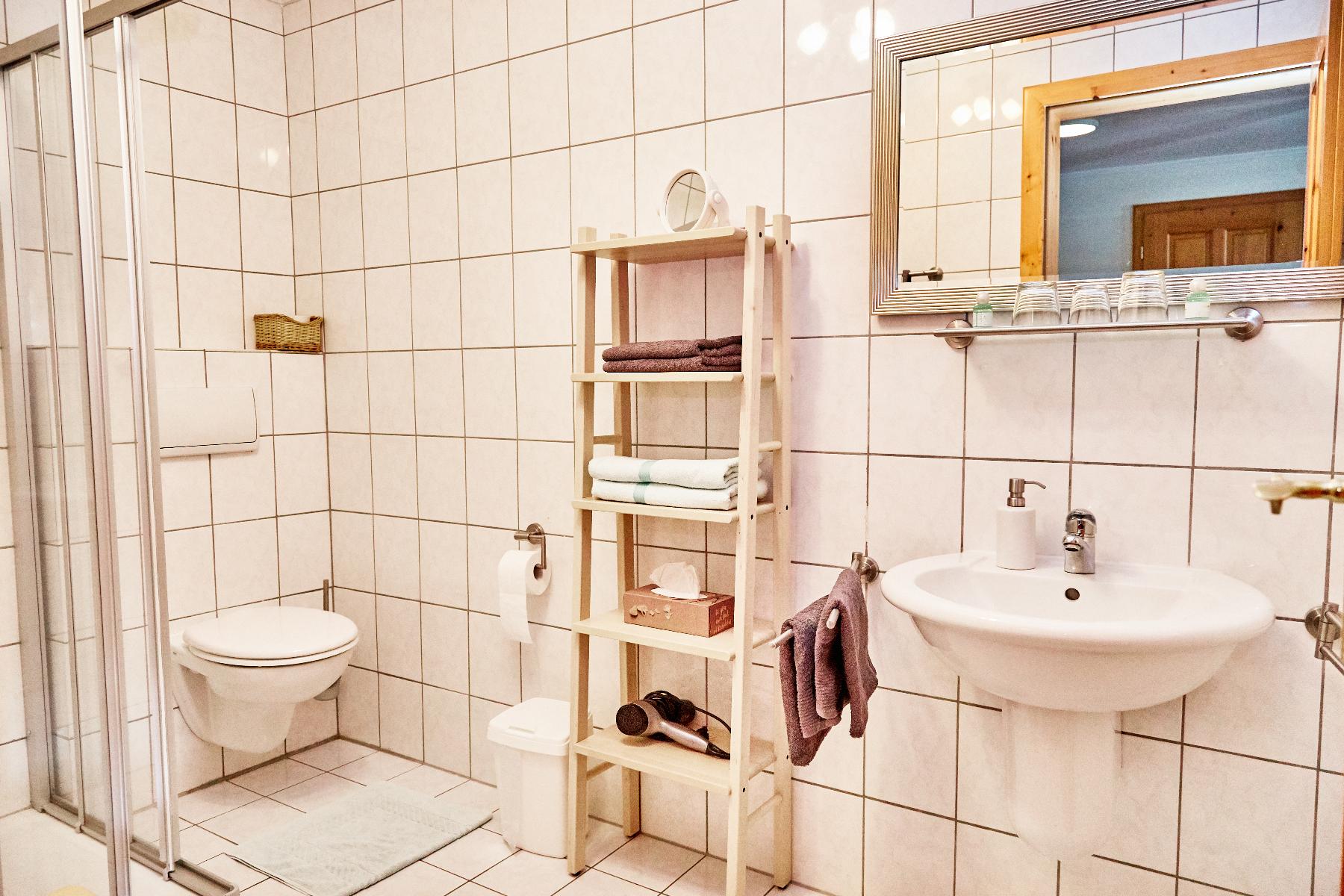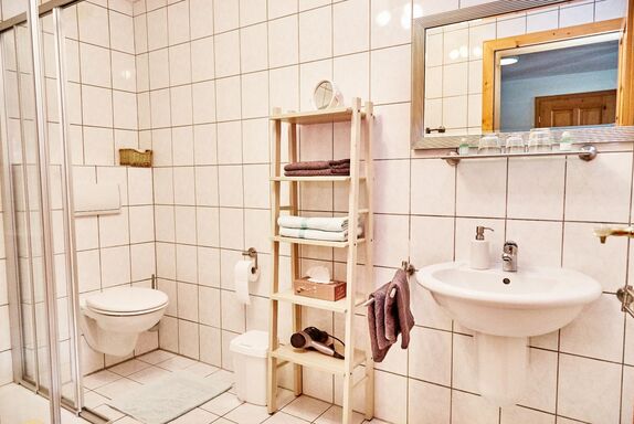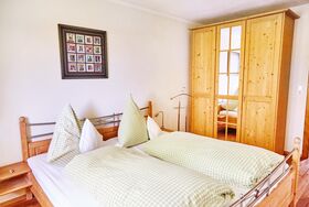 Es sind zwei Schlafzimmer mit Doppelbett. Das Bad besteht aus Dusche/WC, ein Fön ist vorhanden. Radiowecker, TV-Sat mit Flachbildschirm, auf Wunsch CD-Player. Die Wohnung verfügt über einen Balkon/gleichzeitig Außentreppenaufgang.
