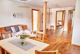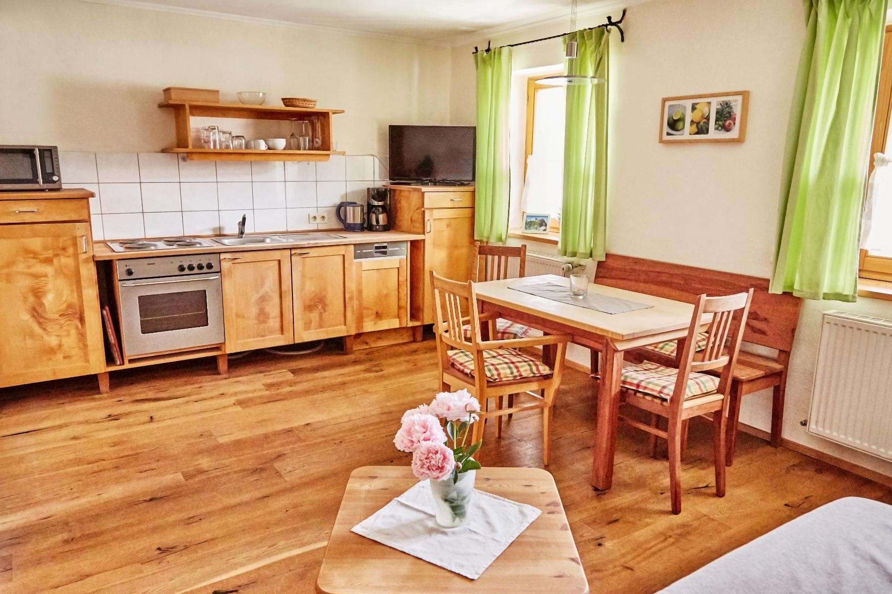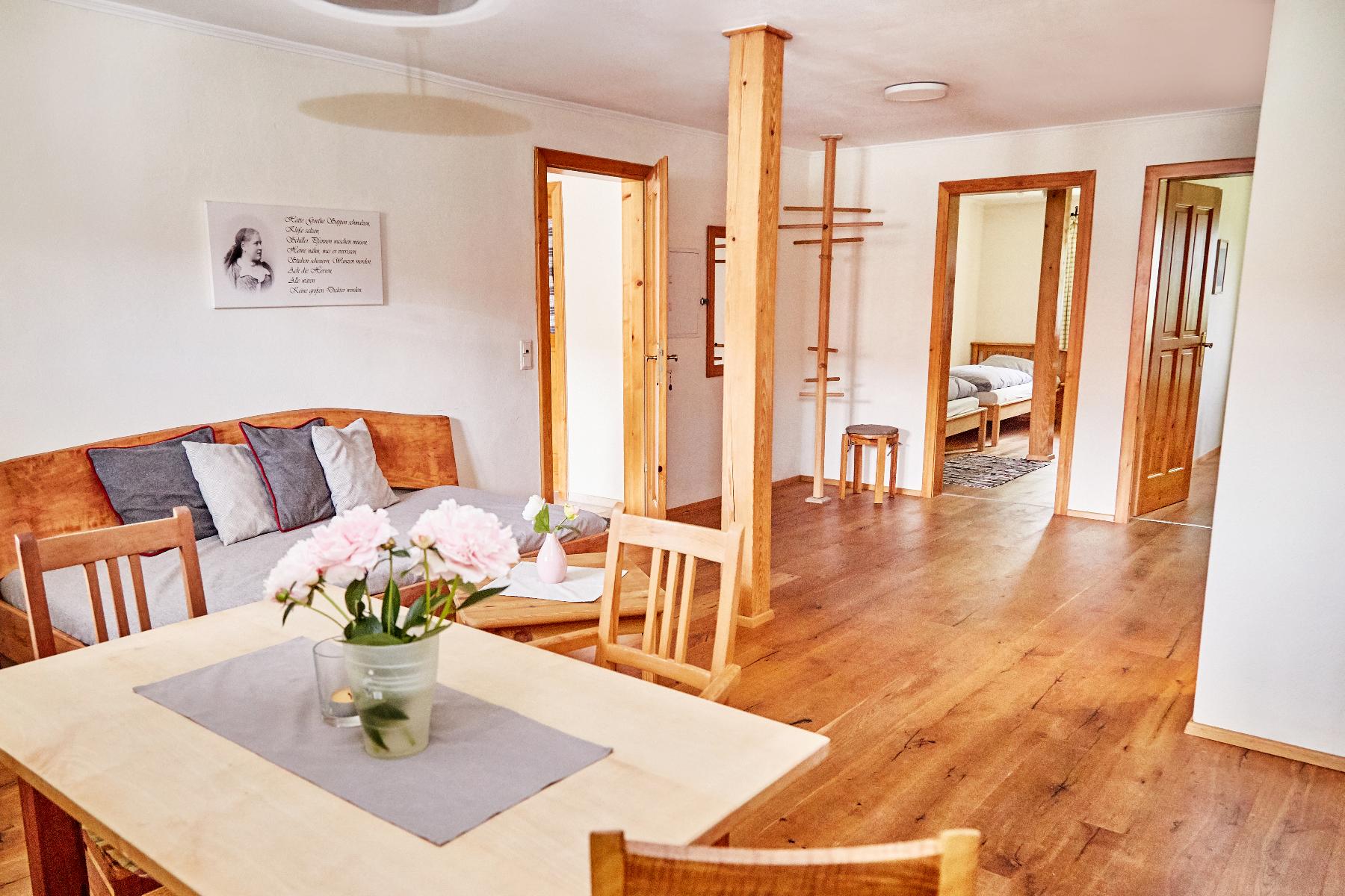 Die Wohnung verfügt über Massiv-Naturmöbel.