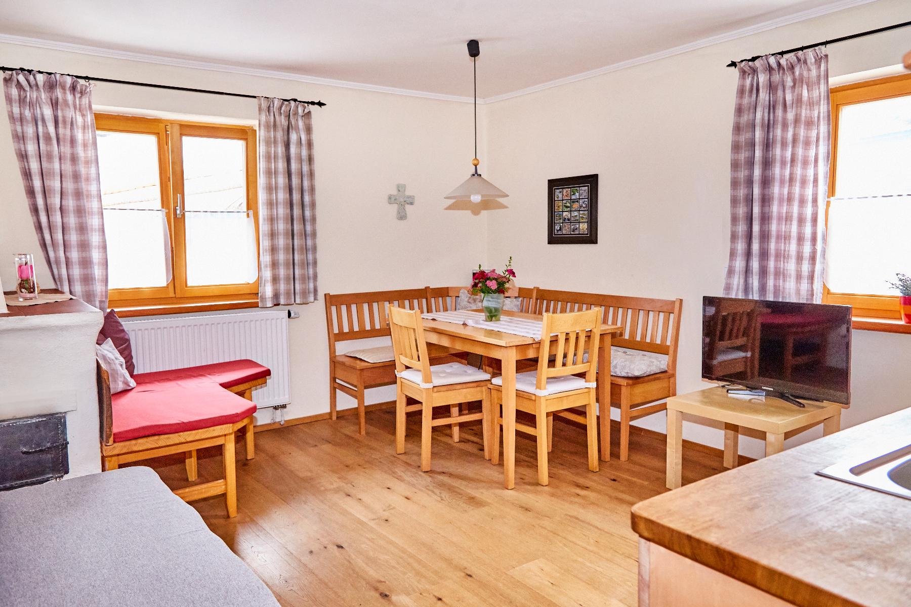 Die Ferienwohnung ist ca. 70 qm groß, neu renoviert, Wohnraum mit Kachelofen, komplett ausgestattete Küche mit Backofen, Wasserkocher, Kaffeemaschine, Toaster, Mikrowelle und Spülmaschine.