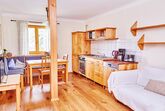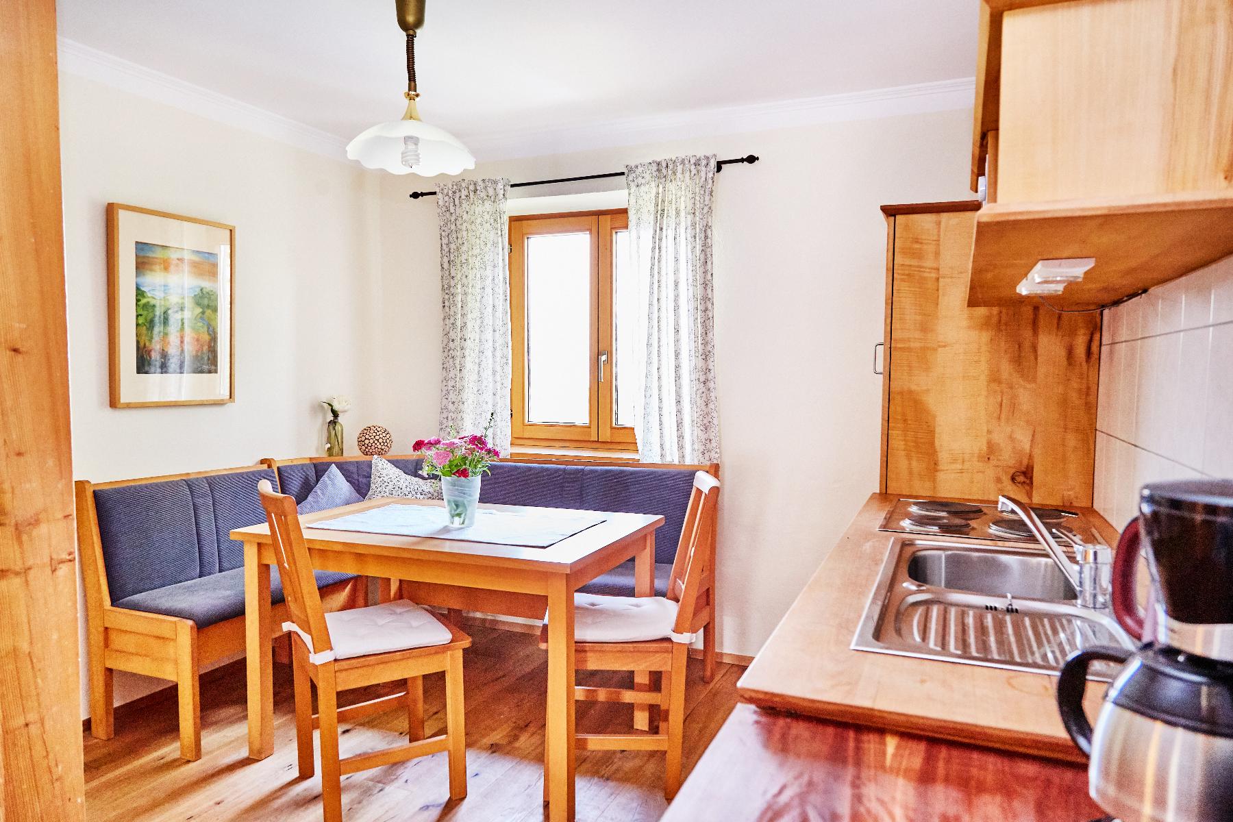 Helle ländlich-fein eingerichtete Ferienwohnung mit Blick auf die ganze Bandbreite des Bayerischen Waldes, Wohnraum mit komplett eingerichteter Küchenzeile, Kaffeemaschine, Toaster, Wasserkocher, Kochmulde mit Backherd, kleines Sofa, TV, 2 Schlafzimmer, eines davon mit Doppelbetten am Fußende offen, das zweite Schlafzimmer sehr großzügig mit Doppelbett und Einzelbett, Dusche/WC,