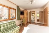 Zimmer mit DU/WC, TV und Balkon. Jedes Zimmer ist mit einem Safe ausgestattet.