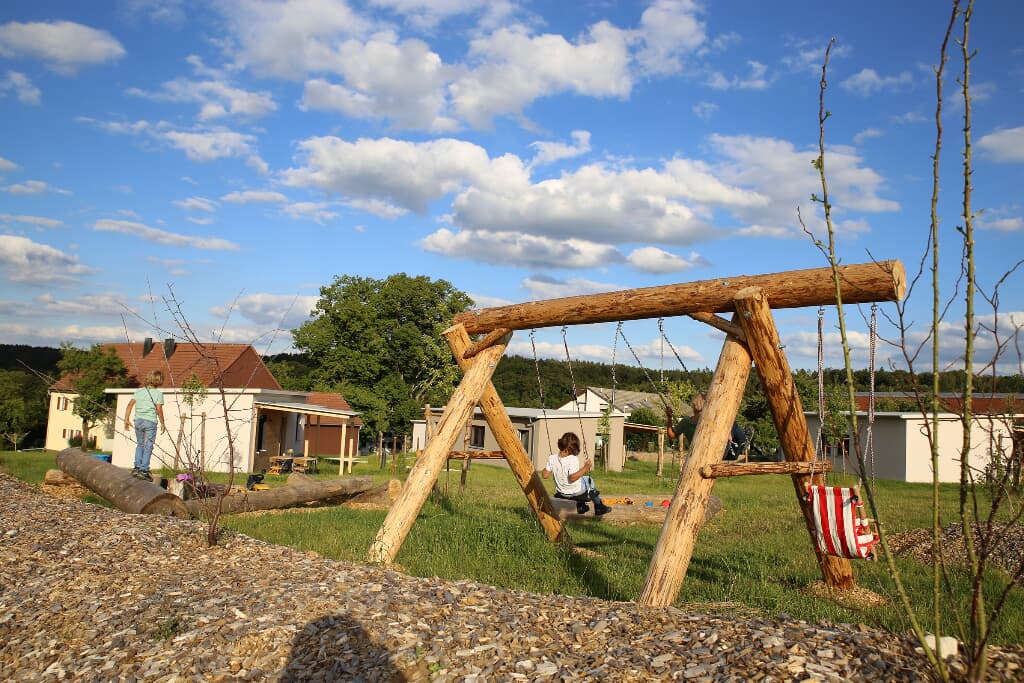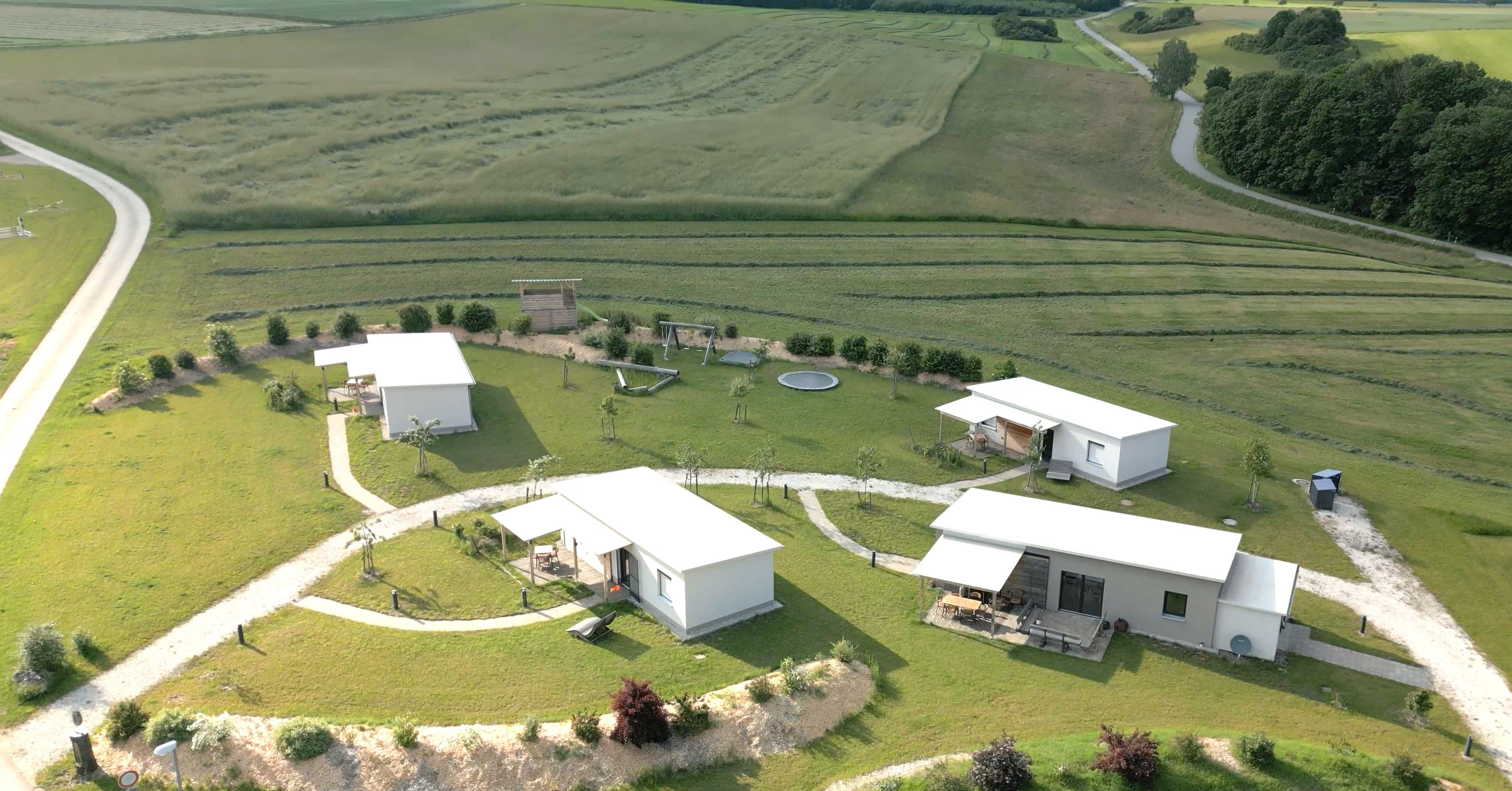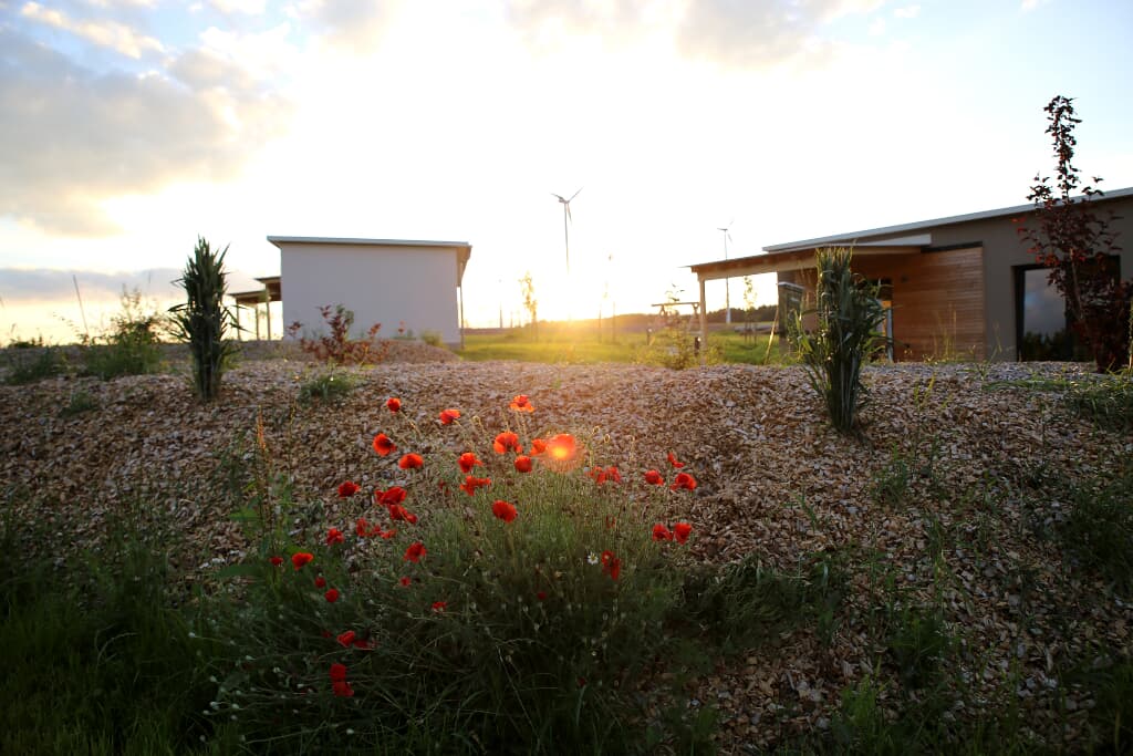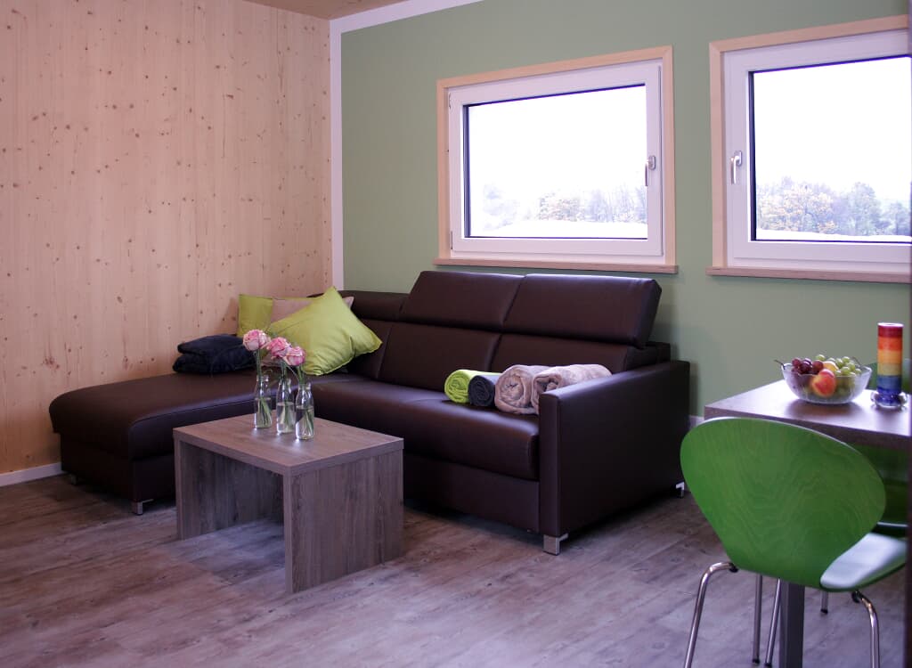 Mit unseren je ca. 44 m² großen einzeln stehenden Chalets mitten im Grünen haben wir ein Areal geschaffen, in dem Sie Auszeit nehmen können, Einblick nehmen können in ländliches Leben, aktiv sein können, eintauchen können in eine Oase für die Seele. Sie entscheiden, ob Sie für sich alleine bleiben wollen oder in Gemeinschaft mit uns und den anderen Gästen aktiv werden. In den 3 identisch aufgebauten Übernachtungschalets befindet sich jeweils ein großes Schlafzimmer für 2 Personen und ein kleineres für 2 Kinder oder einen Erwachsenen. Im Wohn/Essbereich gibt es zudem ein Schlafsofa. Eine kleine, aber komplett ausgestattete Küche inclusive Geschirrspüler und großem Kühlschrank lädt zum Kochen und Genießen ein. Im Duschraum liegen Handtücher und ein Fön für Sie bereit. Eine überdachte Terrasse lädt zum Verweilen an der frischen Luft ein. Die Terrassen sind von den anderen Chalets aus nicht einsehbar. Areal und Chalets sind ebenerdig angelegt und auch für ältere Menschen gut begehbar. Selbstverständlich verfügen die Chalets über WLAN. Wenn sie möchten bieten wir Ihnen morgens ein Frühstück in unserem Seminar-Chalet mit Gemeinschaftsraum, großer Terrasse und Profiküche.