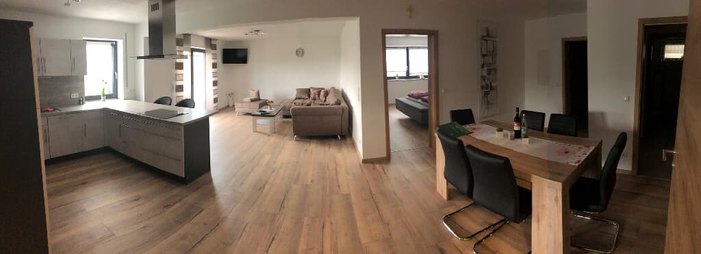 Jede Wohnung verfügt über eine große, hochwertige Küche, die mit einem Geschirrspüler, einer Mikrowelle, einem großen Kühlschrank, einem Wasserkocher, einer Kaffeemaschine sowie Besteck, Geschirr, Gläser und Töpfen ausgestattet ist. Der große Wohnbereich besteht aus einem Essbereich und einer gemütlichen Couchlandschaft mit einem Flachbild-Sat-TV.