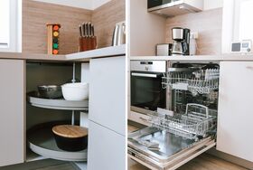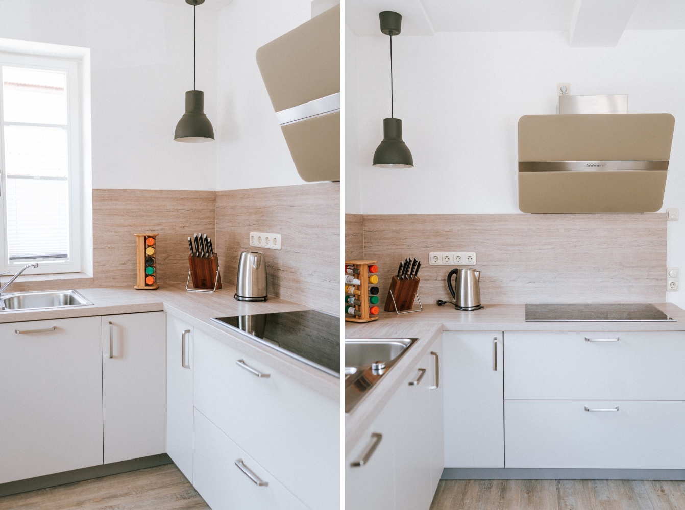 Die Küche ist komplett ausgestattet mit Backofen, Mikrowelle, einem großen Kühlschrank, Filterkaffeemaschine, Tee-/Wasserkocher, Toaster und Eierkocher. Geschirrtücher, Schwamm, Lappen und Spülmittel sind vorhanden. Ebenso gibt es ein Gewürzsortiment, Kaffeefilter, Kaffee und eine kleine Auswahl verschiedener Tees.