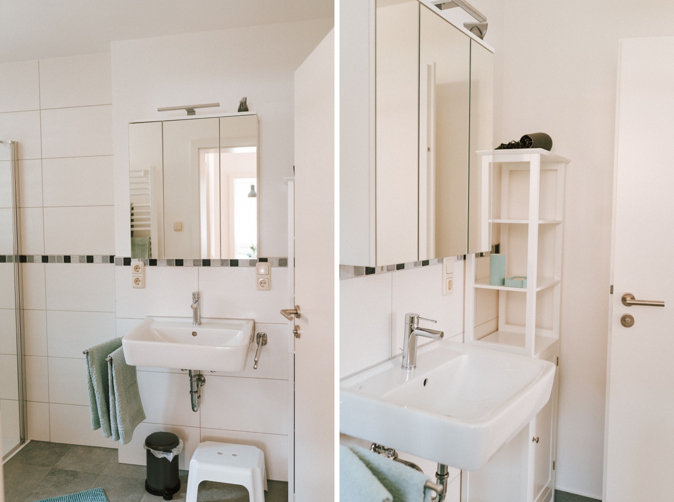 Das Badezimmer hat ein Fenster und verfügt über Dusche, Waschbecken und WC, außerdem gibt es einen Handtuchheizkörper.