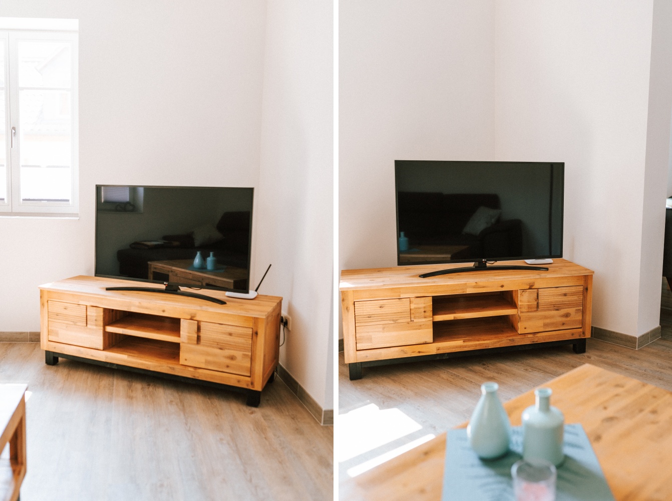Im Wohnzimmer steht eine großzügige Couch und ein großer Fernseher.