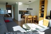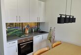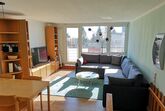 Im Schlafzimmer erwartet Sie eine Schlafcouch für zwei Personen (160 x 200cm) sowie ein Kinderstockbett (90 x 180cm) für bis zu 2 Kinder, ein großer Schreibtisch zum Arbeiten, Lesen, Zeichnen, Malen oder Spielen, ein Kleiderschrank mit ausreichend Stauraum für Ihre Urlaubsutensilien und Nachttische. Der offene Essbereich für 5 Personen ist mit einer hochwertigen Design-Küchenzeile ausgestattet, die unter anderem über ein Ceran-Kochfeld, einen Backofen, eine Mikrowelle, einen Siemens Geschirrspüler, einen Kühlschrank samt Gefrierfach, eine Senseo-Kaffeemaschine und einen Wasserkocher verfügt. Im großzügigen Wohnraum lädt ein hochwertiges Boxspring-Schlafsofa (nutzbar als vollwertiges Doppelbett) zu entspannten Abenden ein. Außerdem stehen Ihnen ein Smart-TV mit Kabelfernsehen, Internetzugang und verschiedene Spiele-Apps sowie eine Stereoanlage mit Radio, CD-Player und Bluetooth zur freien Verfügung. Unterhaltung bietet Ihnen auch die große Auswahl an Büchern, DVDs und Spielen. Vom Wohnzimmer aus gelangen Sie zum sonnigen Süd-Balkon mit Liegestühlen und Lounge Sesseln – perfekte Voraussetzungen für ein entspanntes Frühstück oder den Ausklang eines gelungenen Urlaubstages.