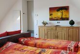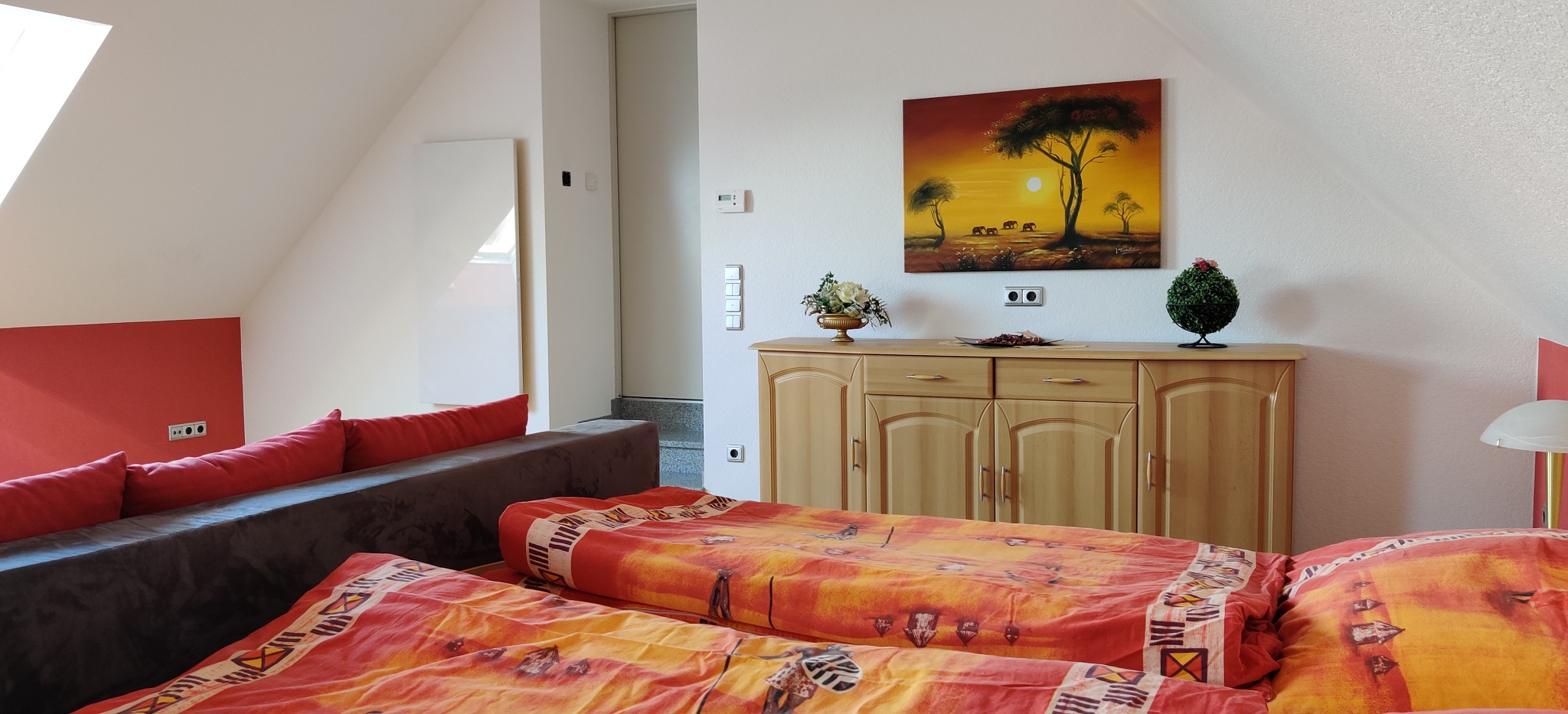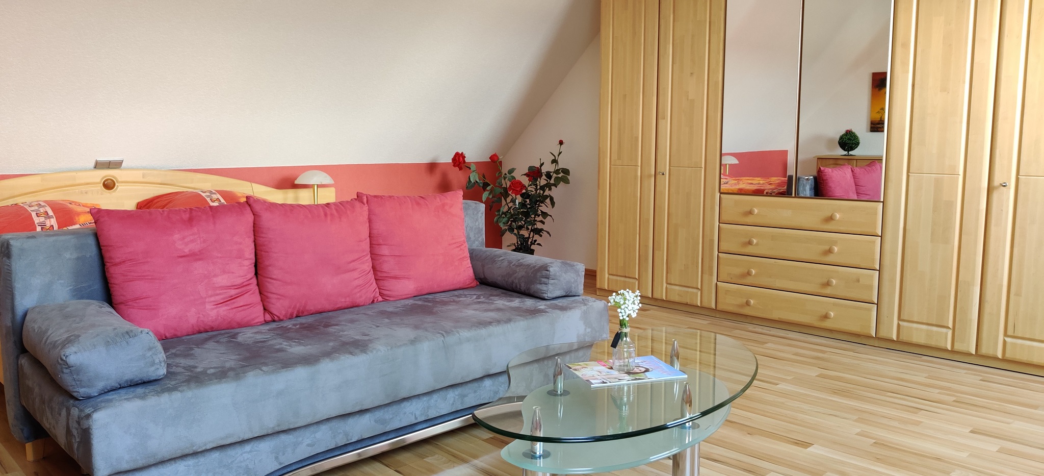 Das Appartement verfügt über ein geräumiges Wohn/Schlafzimmer mit Doppelbett und TV (Sat-Anlage), Schlafcouch und Fußbodenheizung, wahlweise kann ein weiteres Bett gegen einen Mehrpreis in Höhe von 10.-€ dazu gebucht werden.