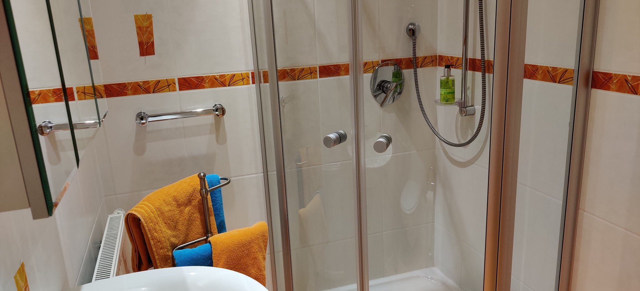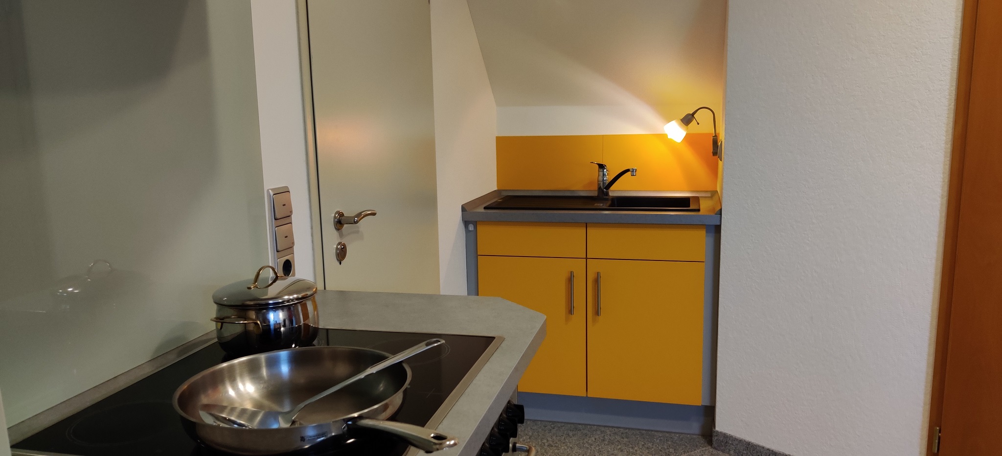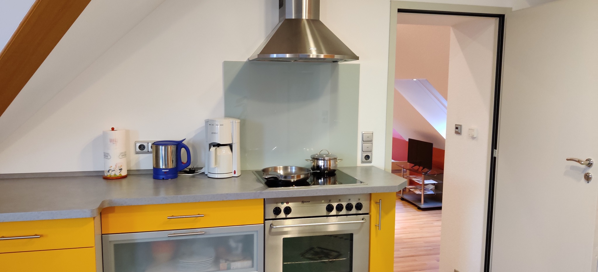 Die separate Einbauküche mit Essecke, Elektroherd, Backofen, Kühlschrank, Dunstabzugshaube, Filter-Kaffeemaschine, Wasserkocher, Geschirr und Geschirrhandtücher lässt keine Wünsche offen. Das Badezimmer mit Eckdusche und WC rundet das Gesamtbild ab.