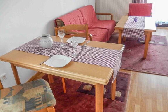 Die lichtdurchflutete 2-Zimmerwohnung bietet idealen Wohnraum für 4 Personen (ein Babyreisebett ist auf Anfrage vorhanden). Der gemütliche Essbereich lädt Sie schon am Morgen zum Frühstück ein – vielleicht nach einem kleinen Spaziergang, verbunden mit dem Einkauf frischer Köstlichkeiten beim Bäcker im Ort. Die gut ausgestattete Küche bietet ihnen dann die Möglichkeit der Zubereitung, sowohl eines frischen Kaffees als auch warme Speisen oder kleine Snacks. Dafür steht Ihnen neben dem Herd auch eine Mikrowelle zur Verfügung. Genießen Sie nach einer ruhigen Nacht ein Bad oder eine Dusche im großräumigen Badezimmer. Im Wohnbereich bieten Ihnen TV und Internet umfangreiche Unterhaltung. Wohn-Schlafraum mit Schlafcouch für 2 Personen. Der geschützte Balkon bietet einen weiten Ausblick in die Natur und lädt zum Verweilen ein. Mit einem Glas Wein z.B. könnte man zum Ausklang, den erlebnisreichen Tag, Revue passieren lassen.