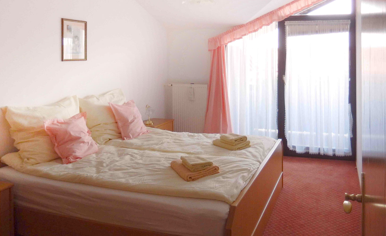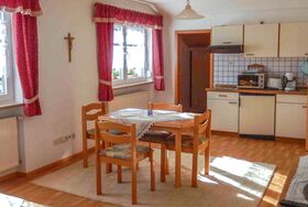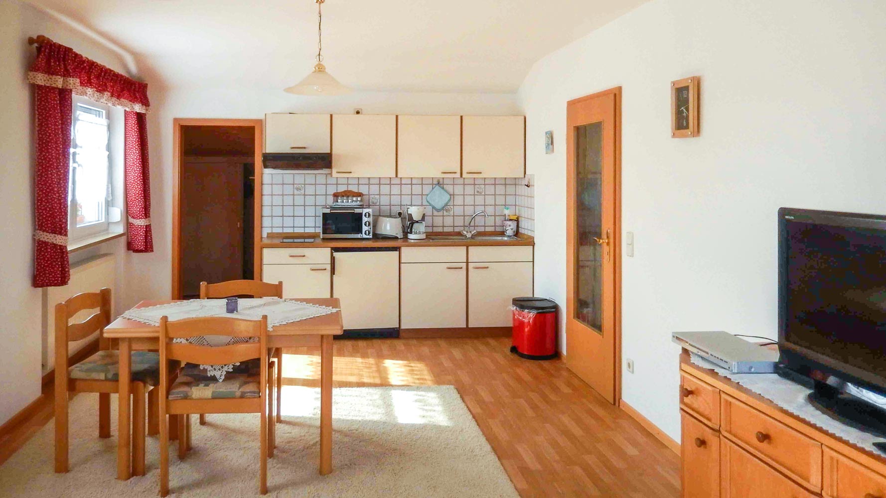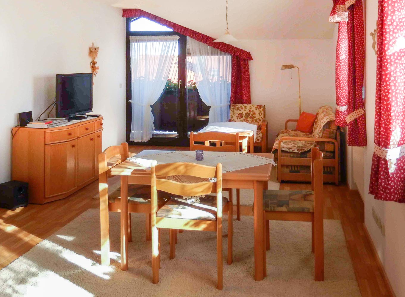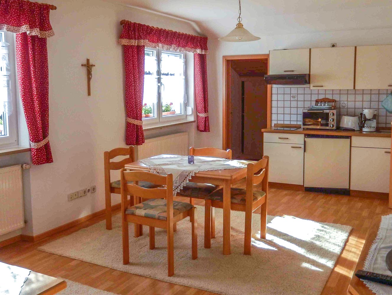Die Ferienwohnung eignet sich für 5 Personen. Neben einem Schlafzimmer mit Doppelbett steht ein weiteres Zimmer mit einem Einzelbett zur Nutzung bereit. Wohn-Schlafraum mit Schlafcouch für 2 Personen. Der Essbereich/Küche bietet  genügend Platz und Komfort zum Kochen, dafür stehen ein modernes Induktionskochfeld, als auch ein kleiner Pizza-Ofen zum Backen zur Verfügung. Aber auch für Unterhaltung ist gesorgt. Relaxen Sie vor dem Fernseher, sehen eine DVD oder lesen ein gutes Buch auf der gemütlichen Couch. Ebenso bietet Ihnen WLAN einen abwechslungsreichen Zeitvertreib.  Vom Wohnbereich aus gelangen Sie auf den Balkon, bestückt mit Gartenmöbeln und haben bei klarer Sicht einen wunderbaren Ausblick bis nach Österreich. Das Badezimmer ist ausgestattet mit einer Duschkabine .