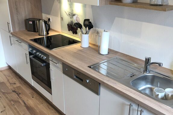 Die Küchenzeile verfügt über einen Backofen, Kühlschrank mit Gefrierfach, Wasserkocher und Toaster.