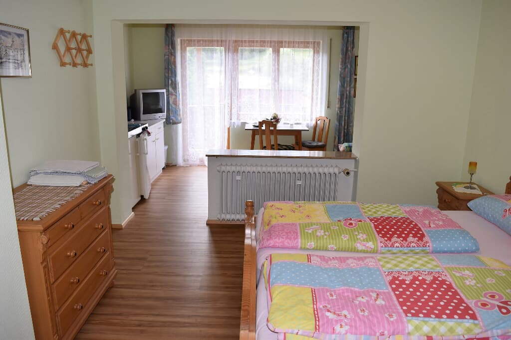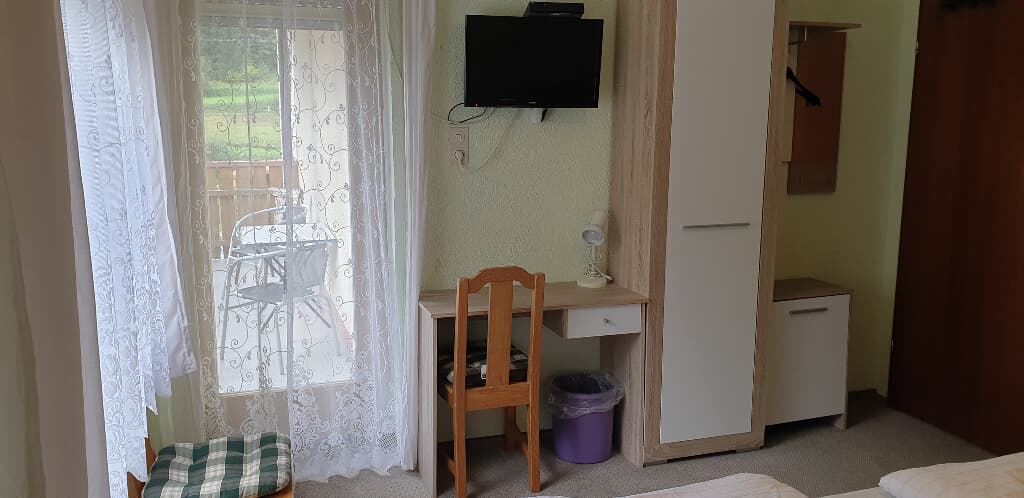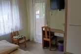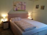 Unserer Doppelzimmer mit Doppel-Boxspringbett, einen eigenen Balkon und einen Sat-TV. Das Badezimmer ist mit einer Badewanne/Dusche, einem WC und einem Waschbecken ausgestattet.