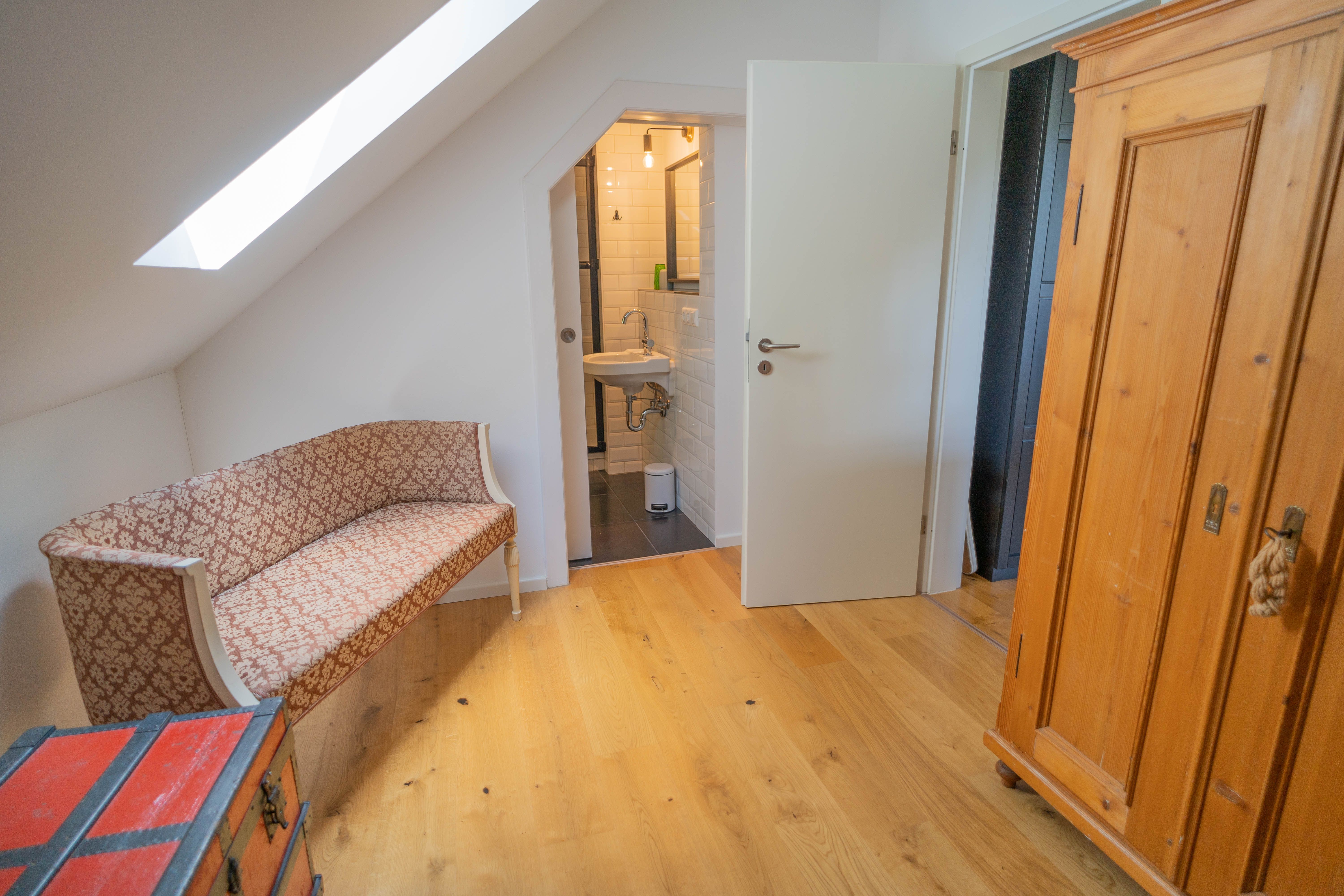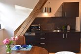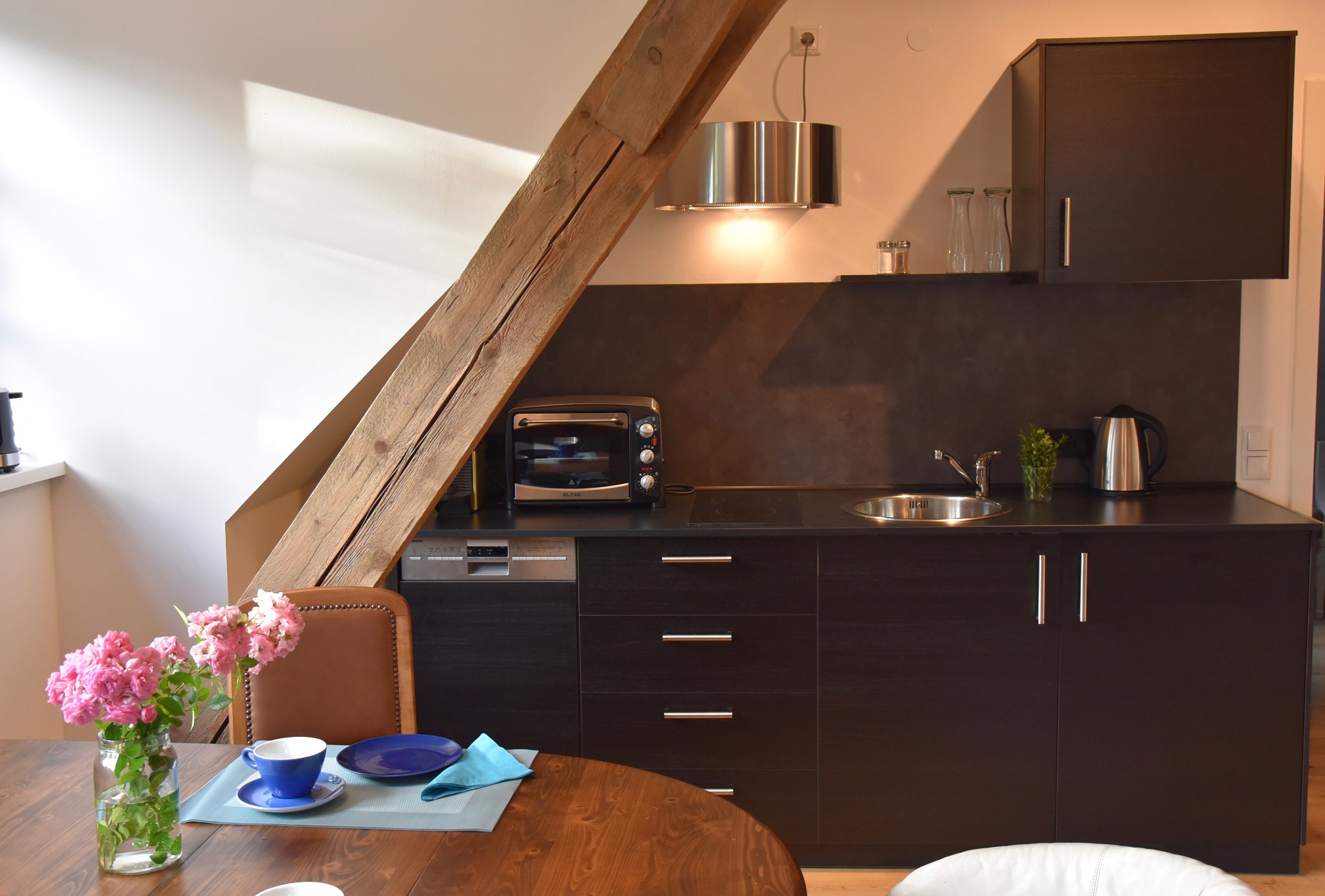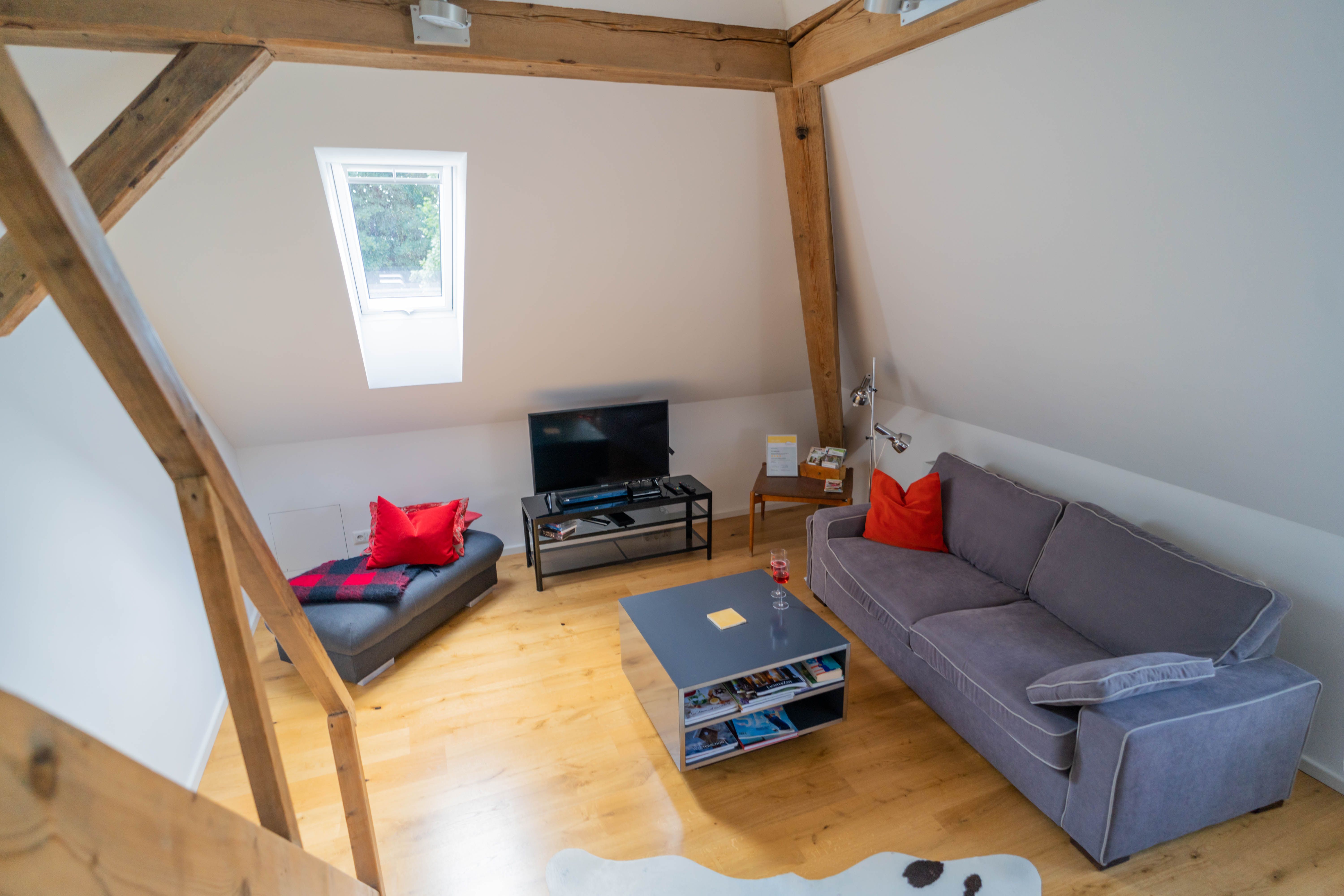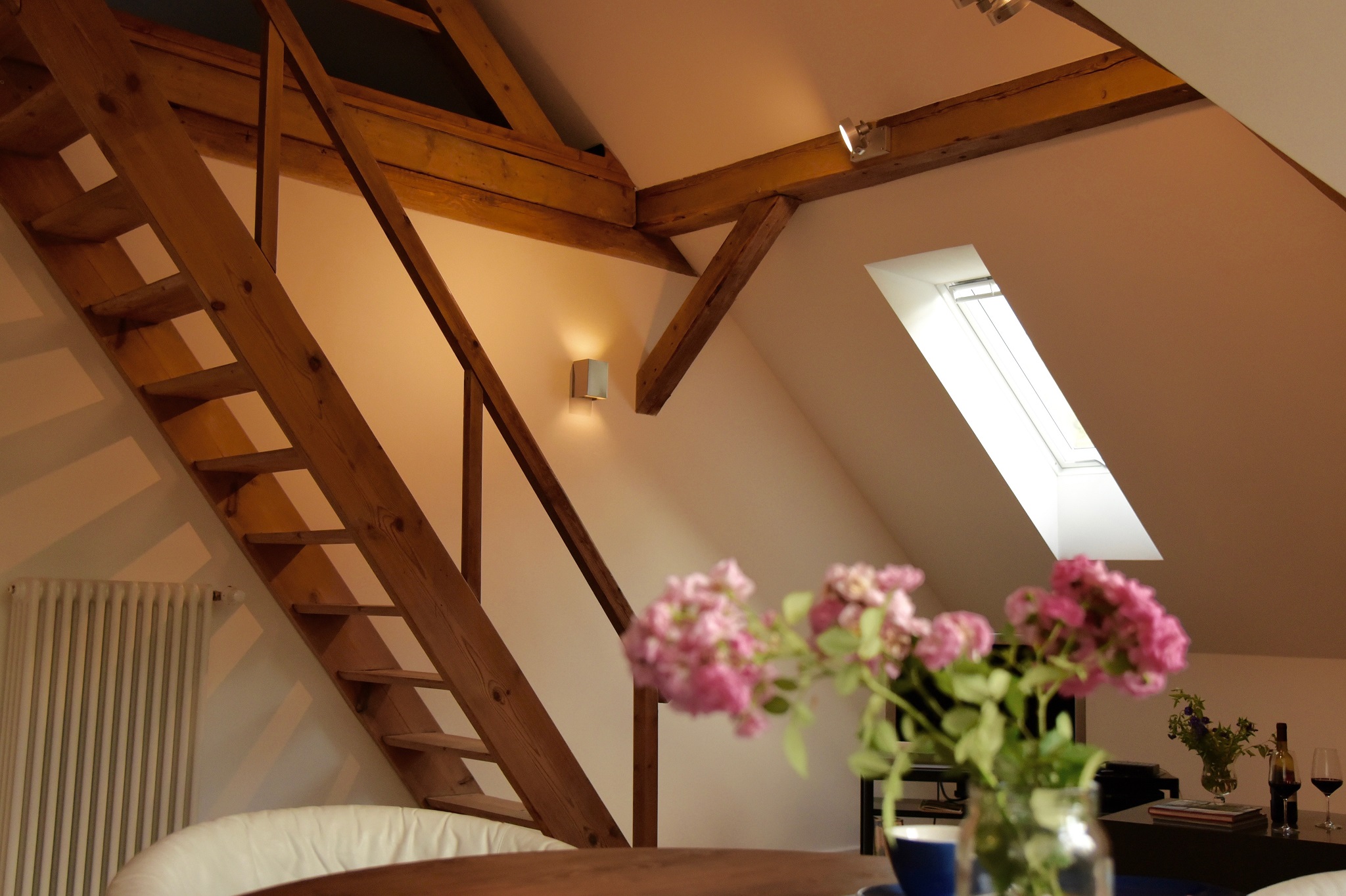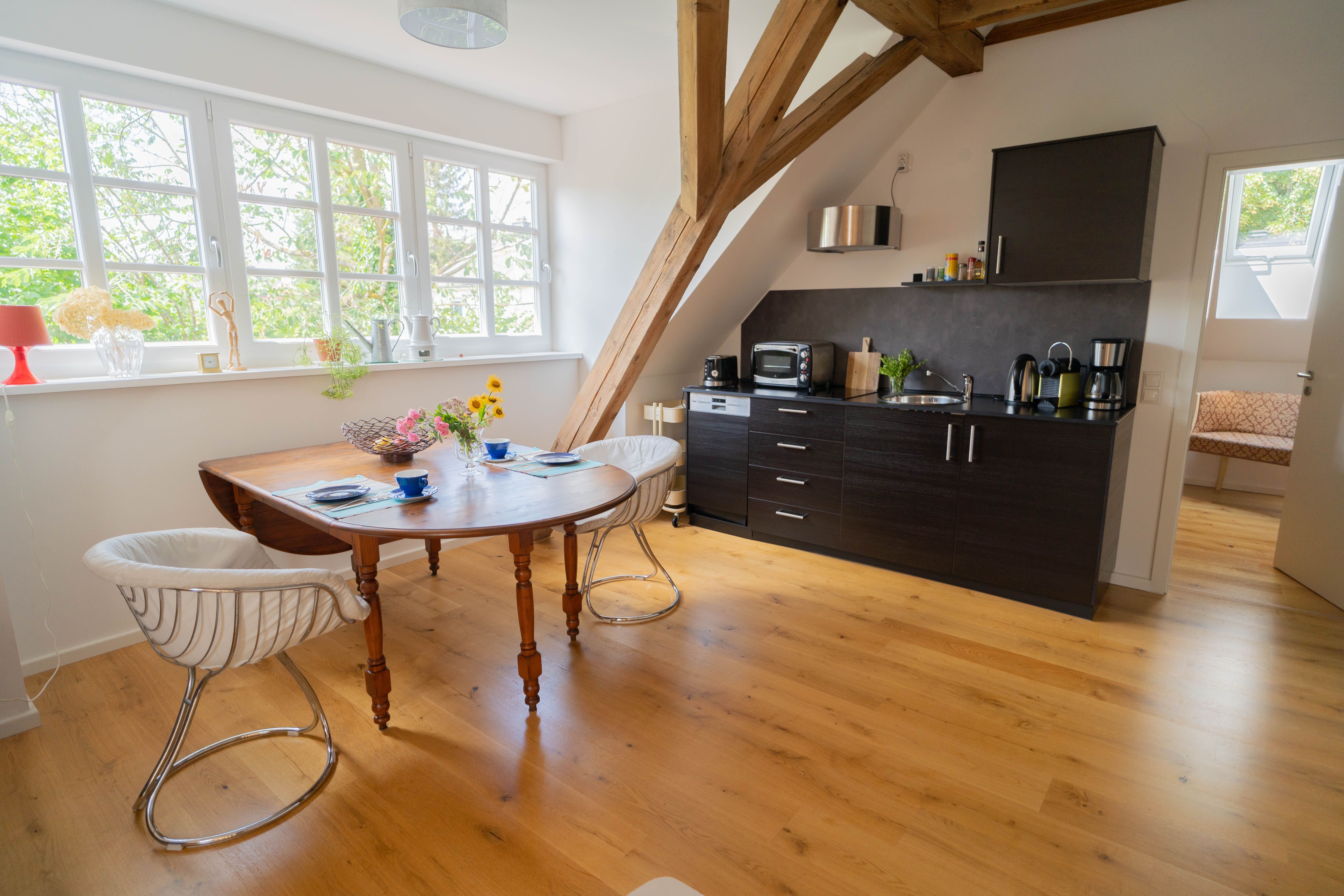 Das liebevoll sanierte, ca. 64qm² Appartment, bietet Ihnen auf zwei Etagen stilvolles Ambiente. Unter den Dachgiebeln mit Blick in den Himmel befindet sich das Schlafzimmer mit einem Doppelbett (180x200). Im unteren Bereich ist das Bad (mit WC und Raindrop-Dusche), der Wohn-/Essbereich mit einer modernen, offenen Küche umgeben von freiliegenden Balken. SAT-TV und W-LAN, lassen einen die Welt um das ruhige Appartment nicht vergessen.