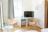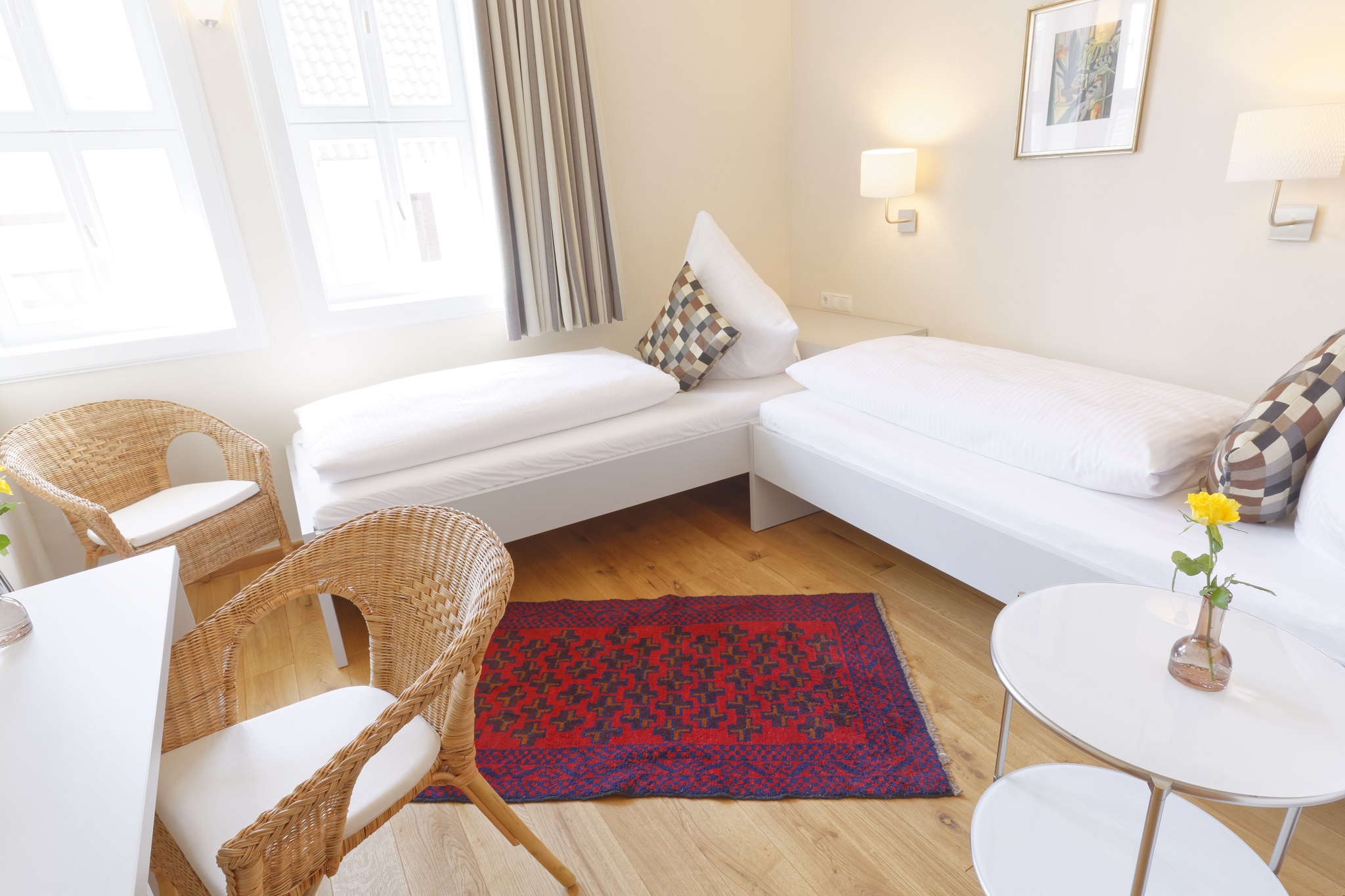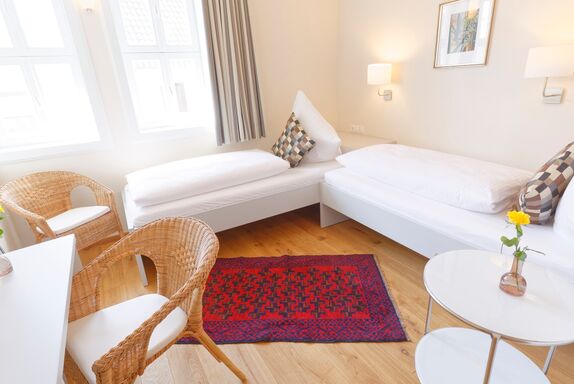 Zweibettzimmer im Gästehaus mit zwei Einzelbetten und Sitzgelegenheiten. Badezimmer mit Dusche und WC.