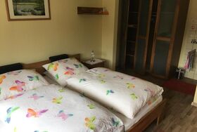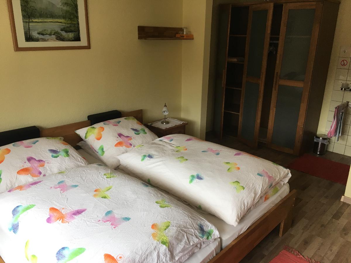 Das Zimmer besteht aus einem Doppelbett (Zustellbett auf Anfrage), einem kleinen Tisch mit 2 Stühlen und einem Waschbecken (Gemeinschafts-Dusche und WC auf der Etage) und einer gemeinschaftlichen Terrasse
